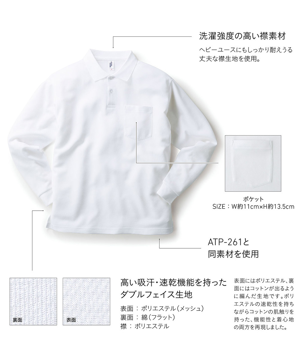 | 商品説明 | 多様なシーンで活躍する裏面ドライ長袖ポロシャツの登場です。 |