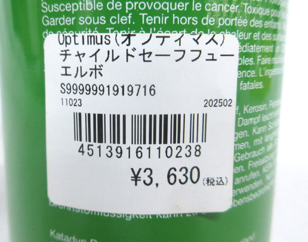 | 内 容 | ■オプティマス チャイルドセーフ フューエルボトル 燃料ボトル(11023) ■内容量:530ml ■カラー:グリーン 内面はコーティングされているのでホワイトガソリン、 灯油、アルコール等あらゆる種類の燃料に使用可。 小さなお子さまが開けられないように チャイルドセーフキャップを採用しています。 ◆総額 7260円相当 ※商品に汚れあります |