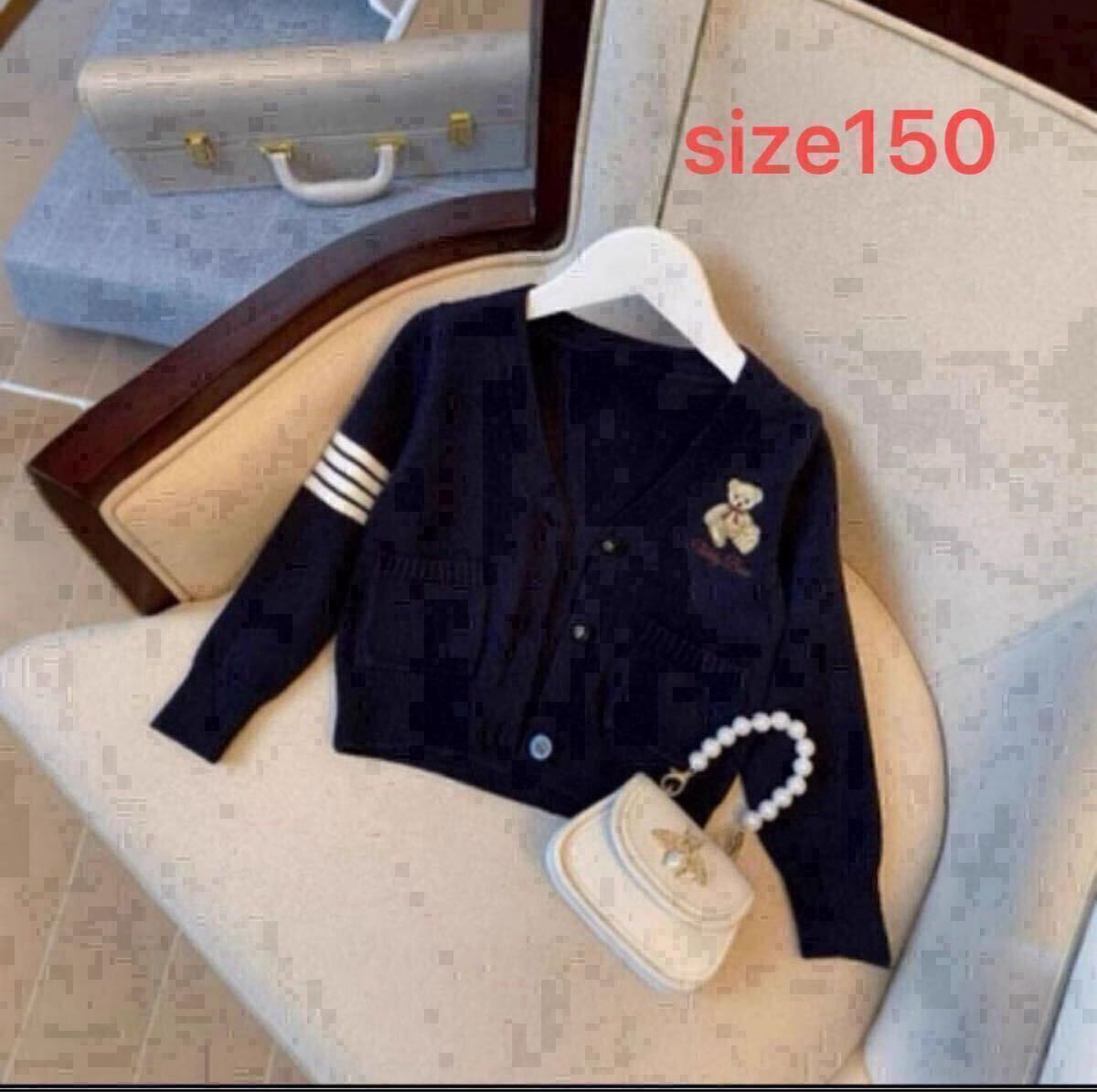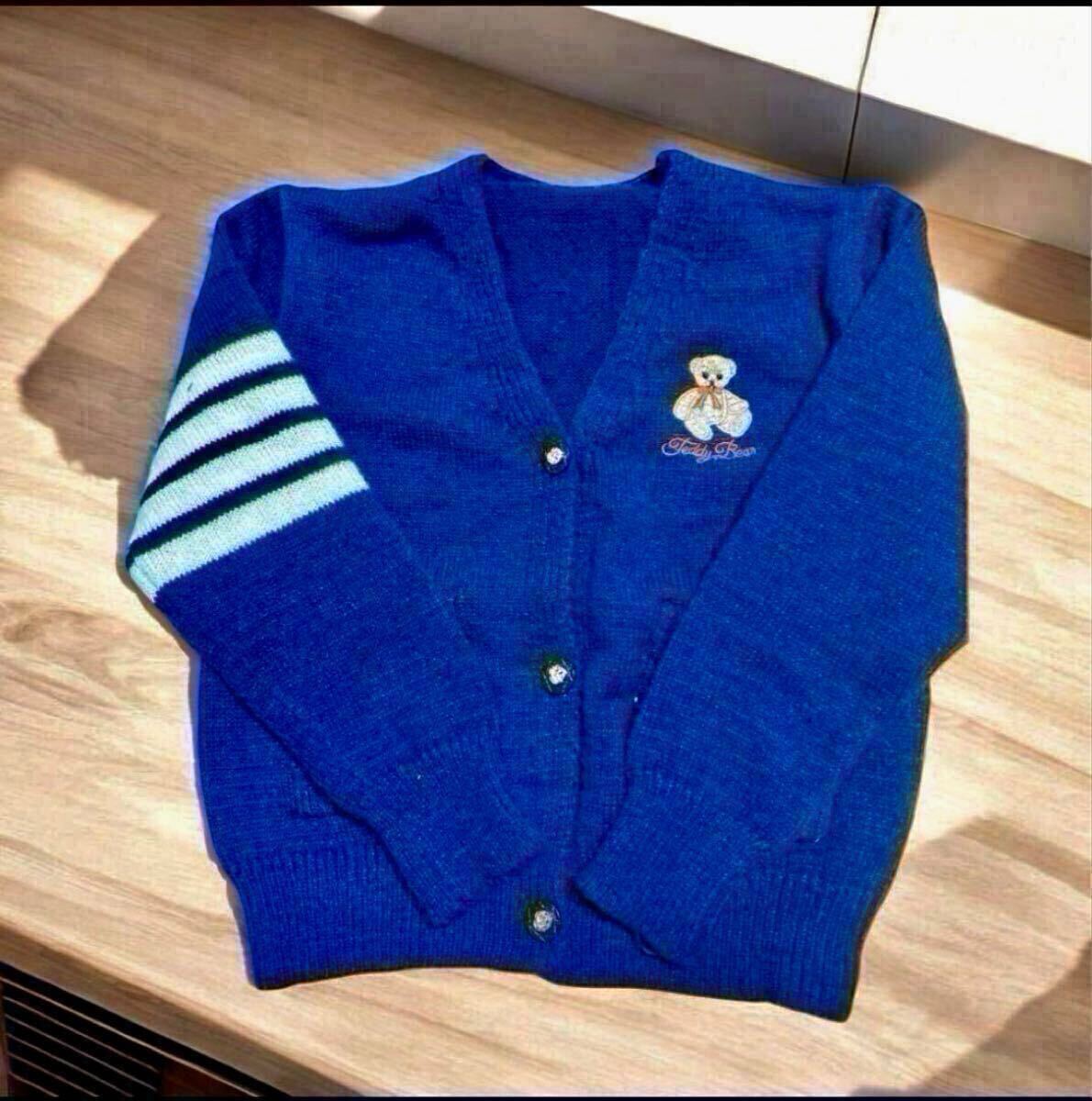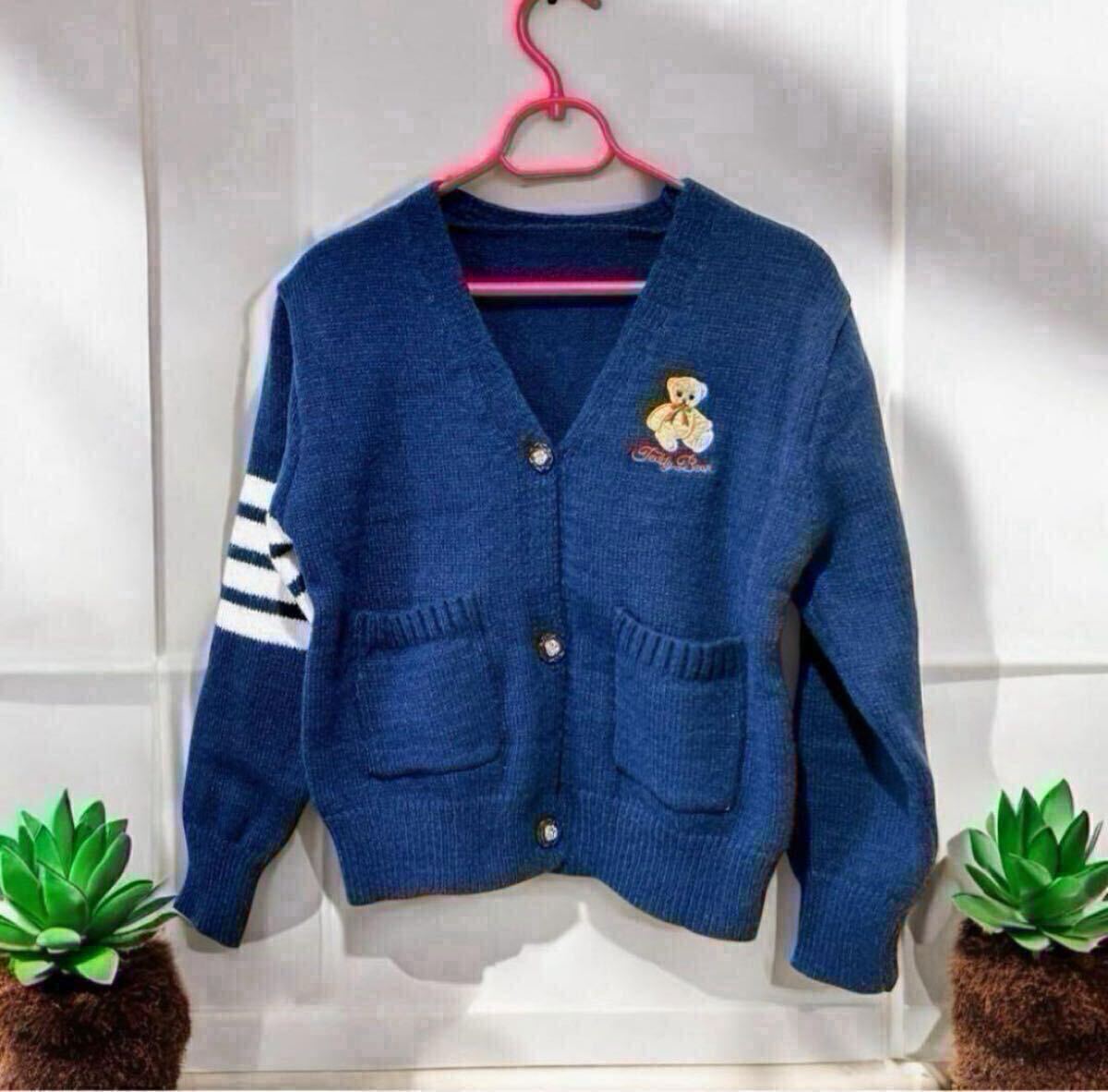 - カーディガンは落ち着いた紺色で、胸元に可愛いクマの刺繍が施されています。厚みがあり、上品に見えるデザインです。
