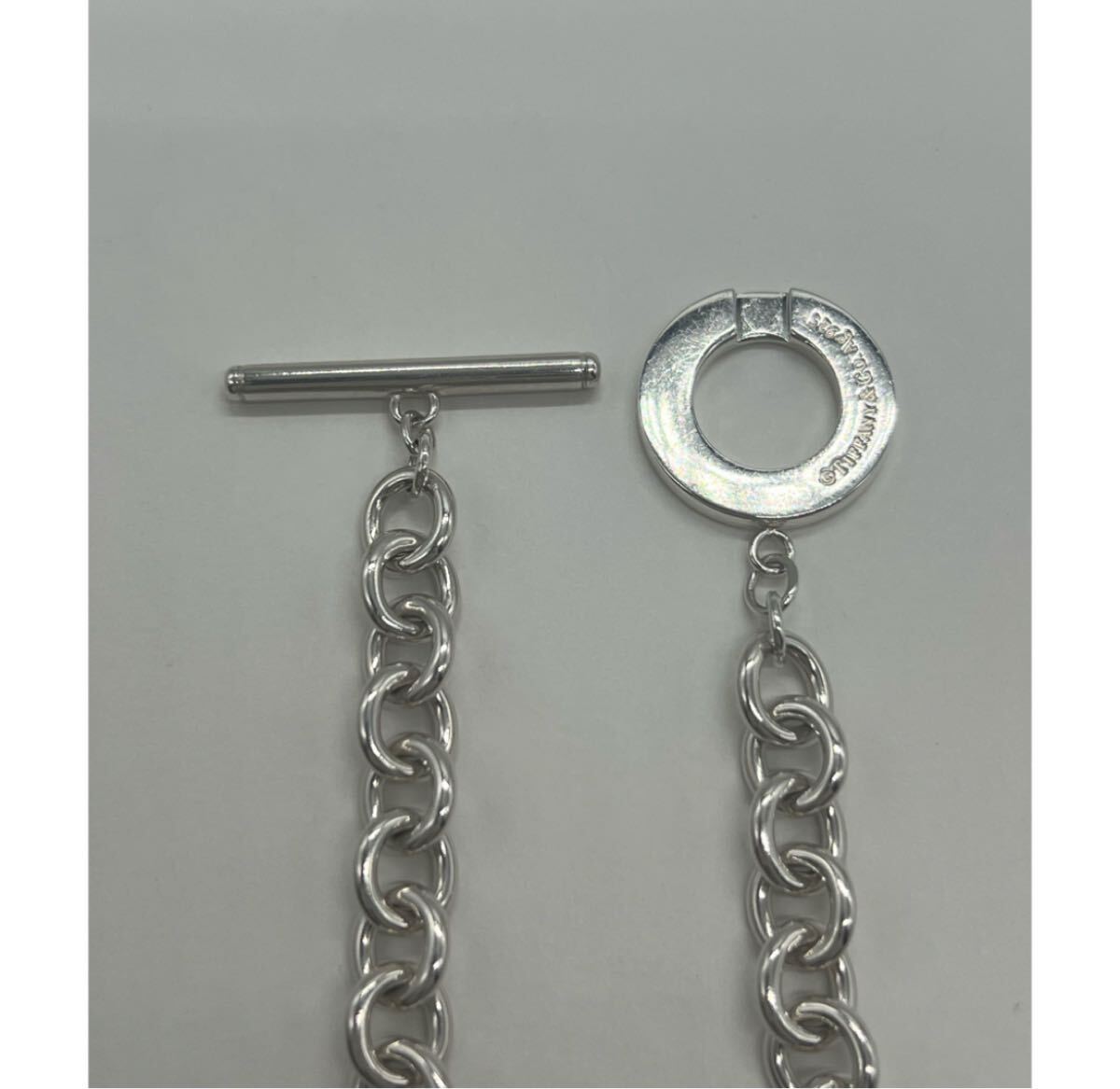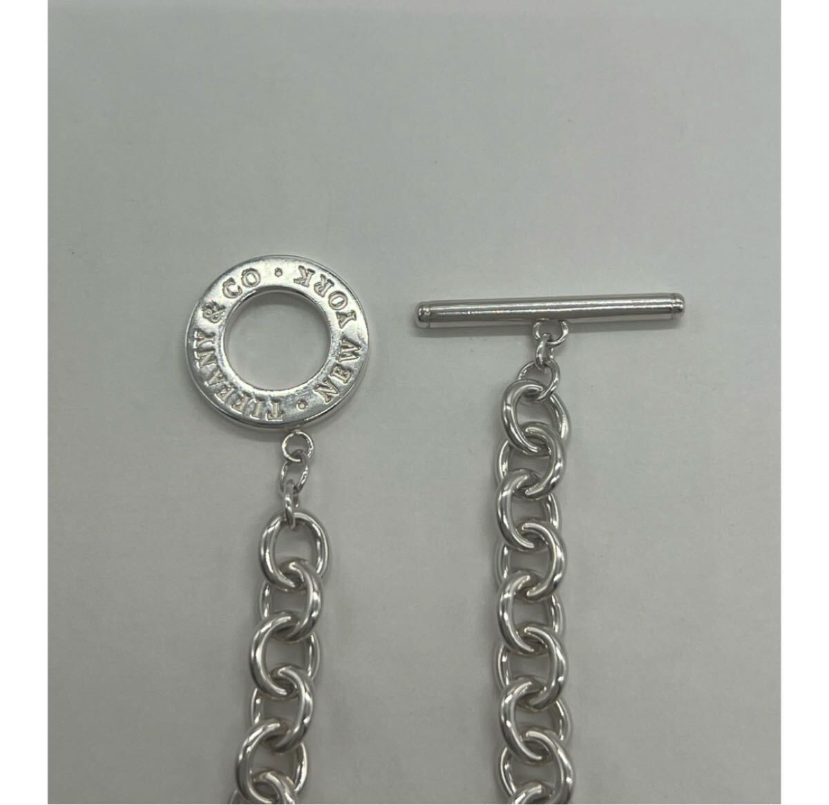 ティファニーで人気のドーナツリンクチェーンに留め具はトグルのデザインになっており、シンプルなデザインはどんなシーンにも合わせることができ、流行に左右されずこれから先長く着用いただけます。