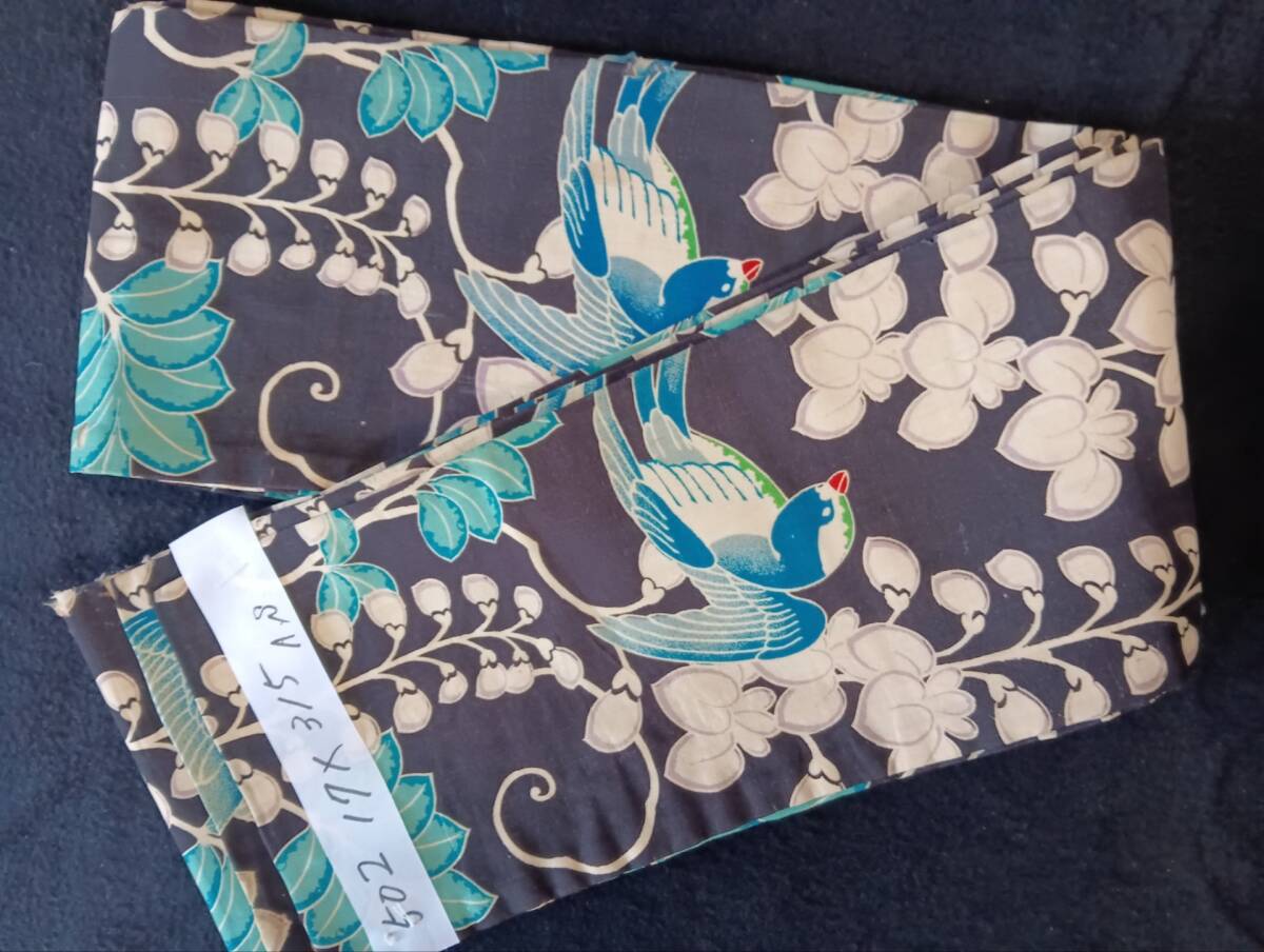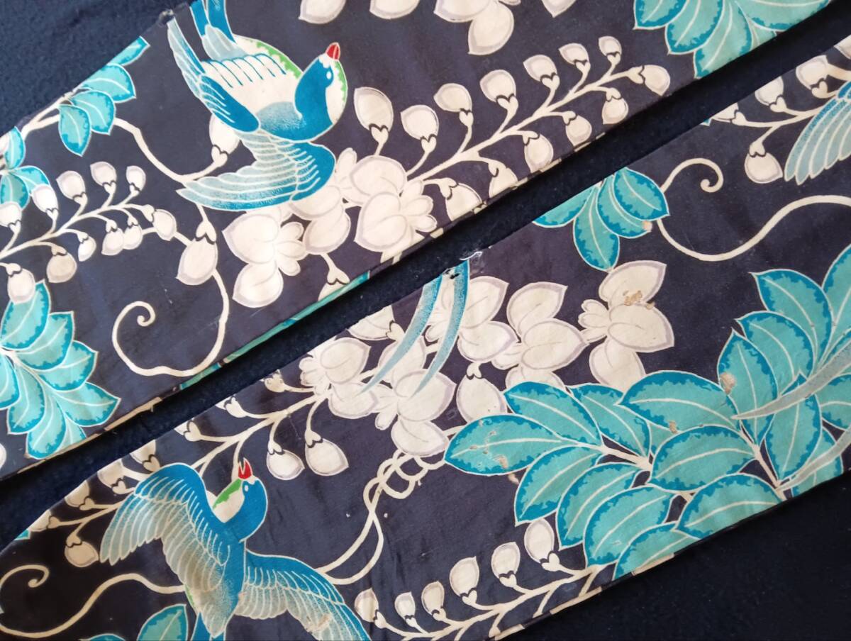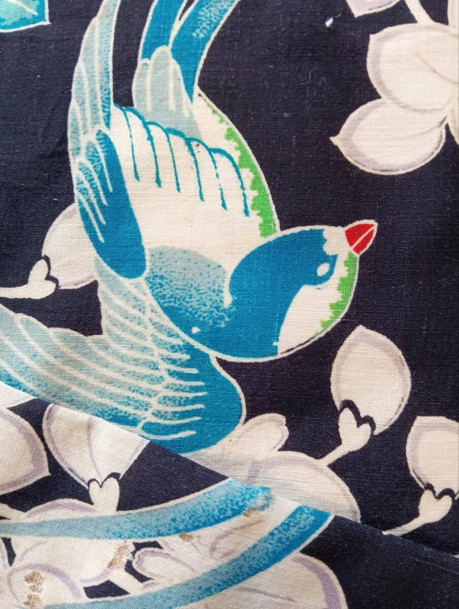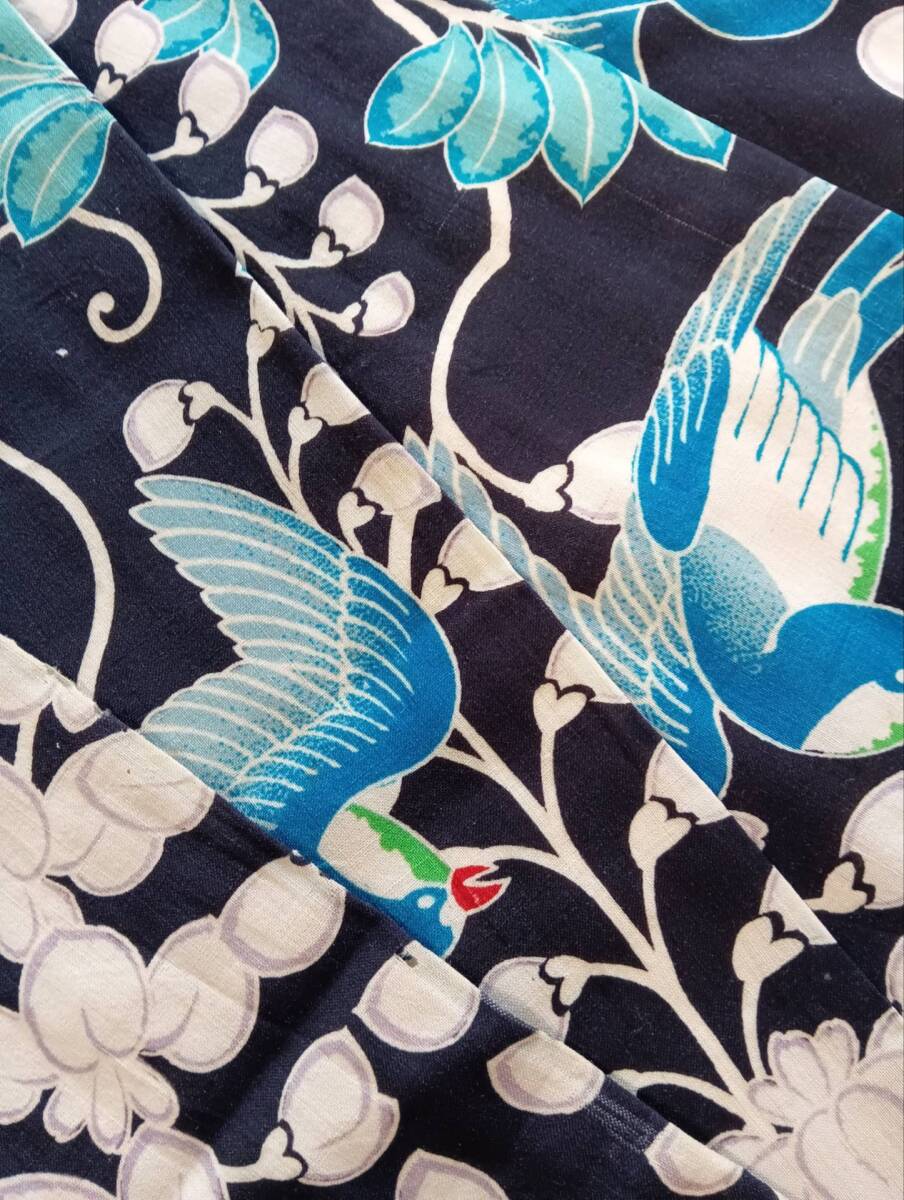 黒地にきれいなブルーと藤の花 くちばしの赤い小鳥の古布です。