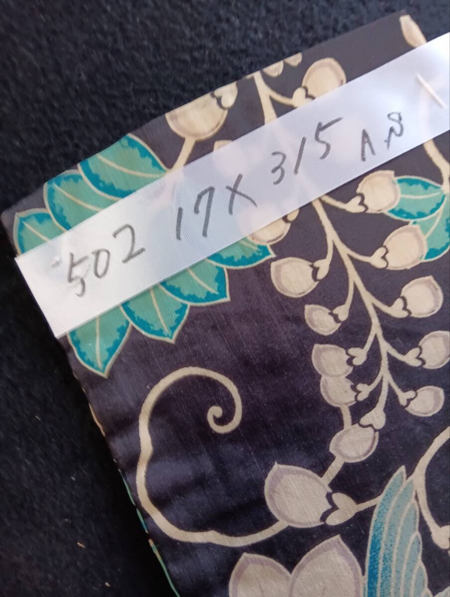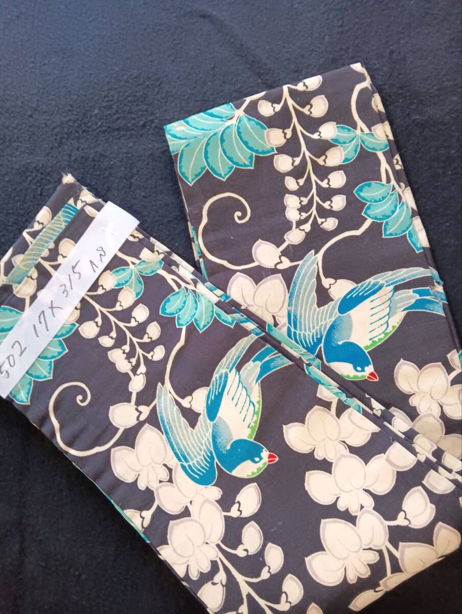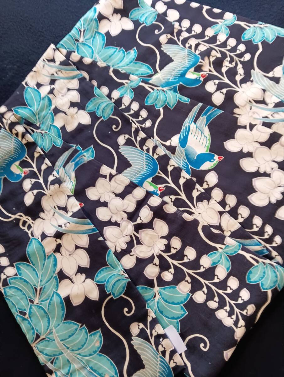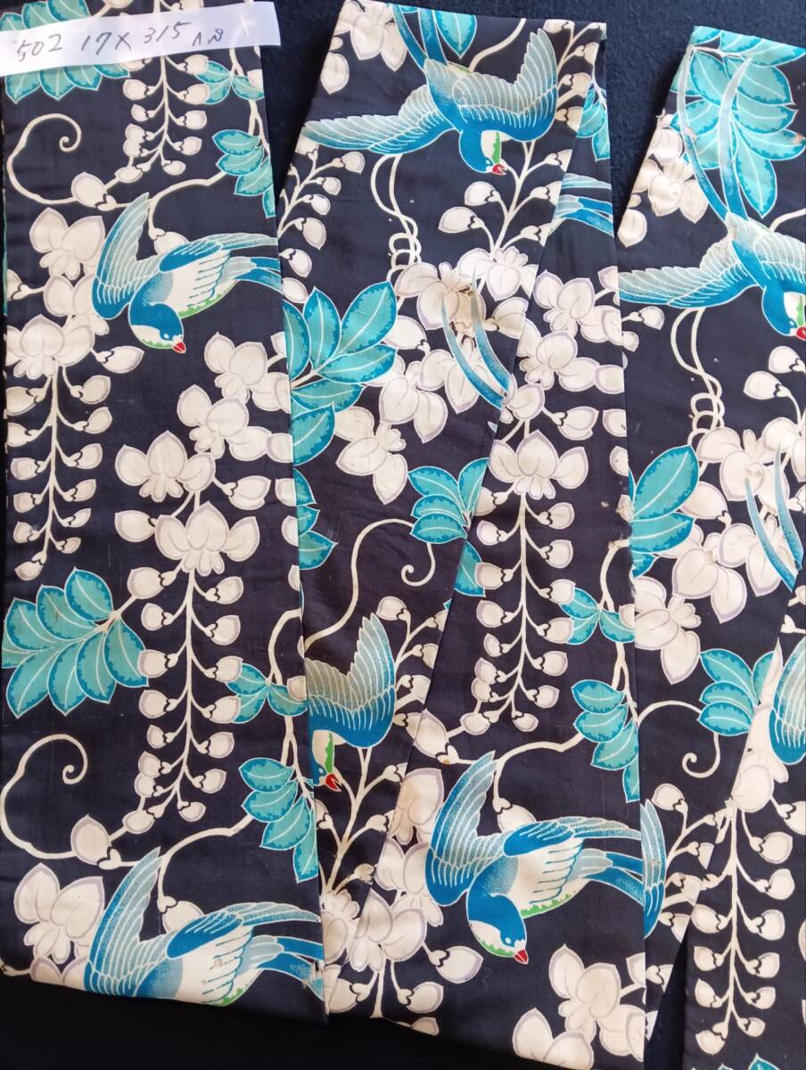 黒地にきれいなブルーと藤の花 くちばしの赤い小鳥の古布です。