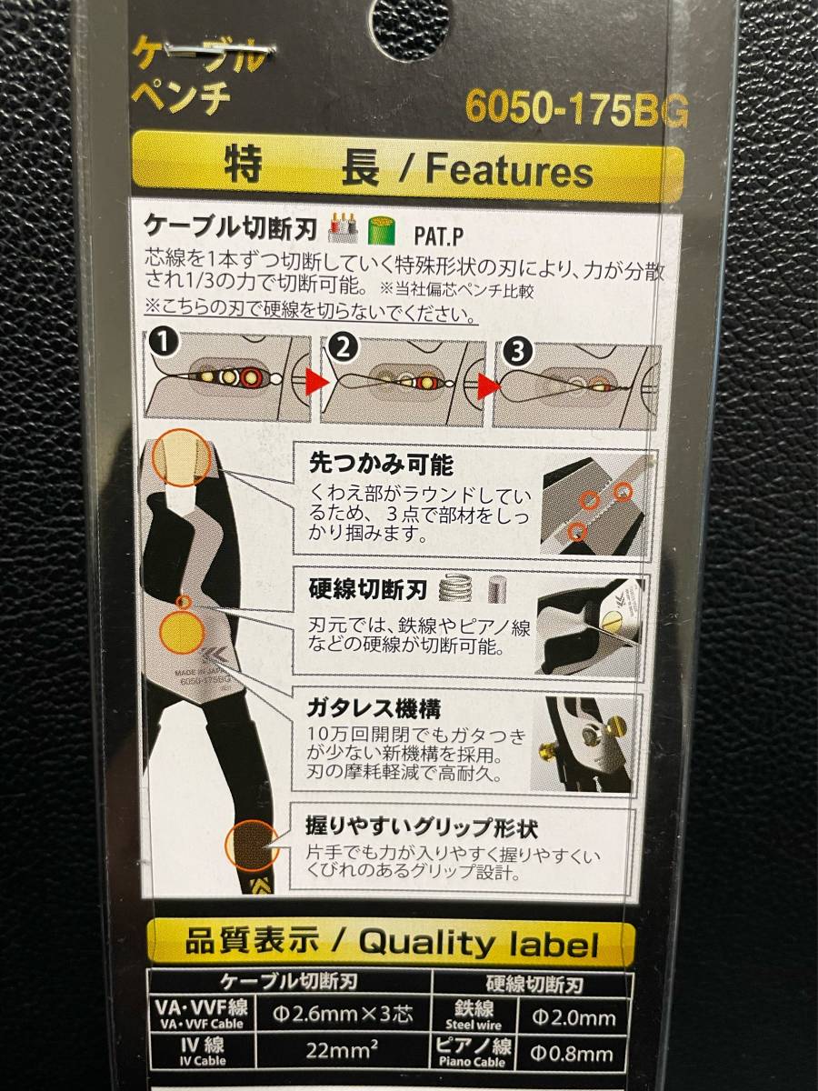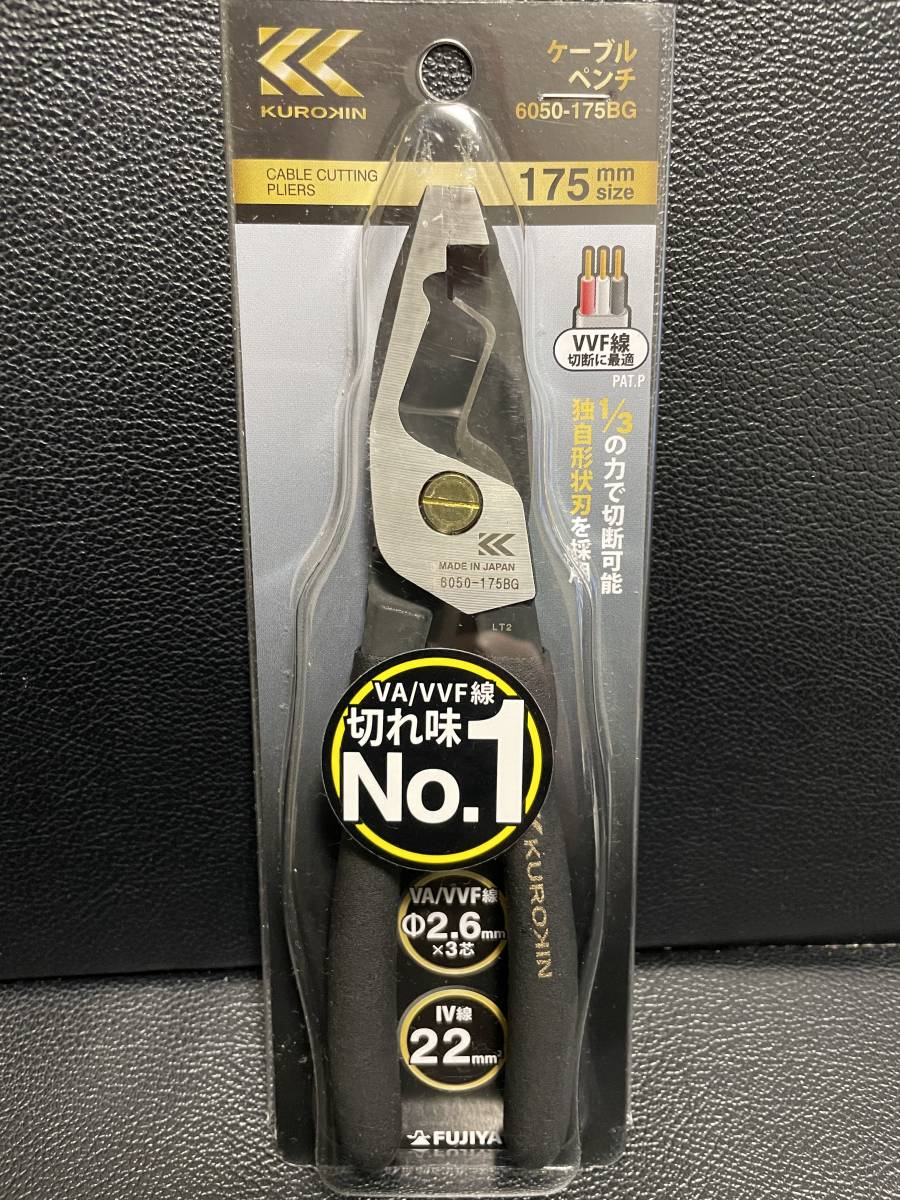 フジ矢・KUROKIN/6050-175BG/ ケーブルペンチ175mm(KUROKIN) <用途> 電気工事でのVVF・VA線切断作業に最適です。 <特徴> ・新設計の刃形状によりVA・VVF線、IV線が驚くほどラクに切断可能! ・新型形状のグリップや、すべてが新しい革新的なペンチです 刃元では鉄線Φ2.0mm、ピアノ線Φ0.8mmの切断が可能なうえに、先端くわえ部のラウンドした形状による3点保持で薄い板でもしっかり掴めます! ◆詳細はメーカーホームページをご参照ください。 ◆ノークレーム、ノーリターンでお願い致します。 ◆神経質な方の入札はご遠慮下さい ※パッケージに小傷や割れがあります ◆落札後24時間以内のお取引開始、2日以内にご入金出来る方のみの入札をお願いします。