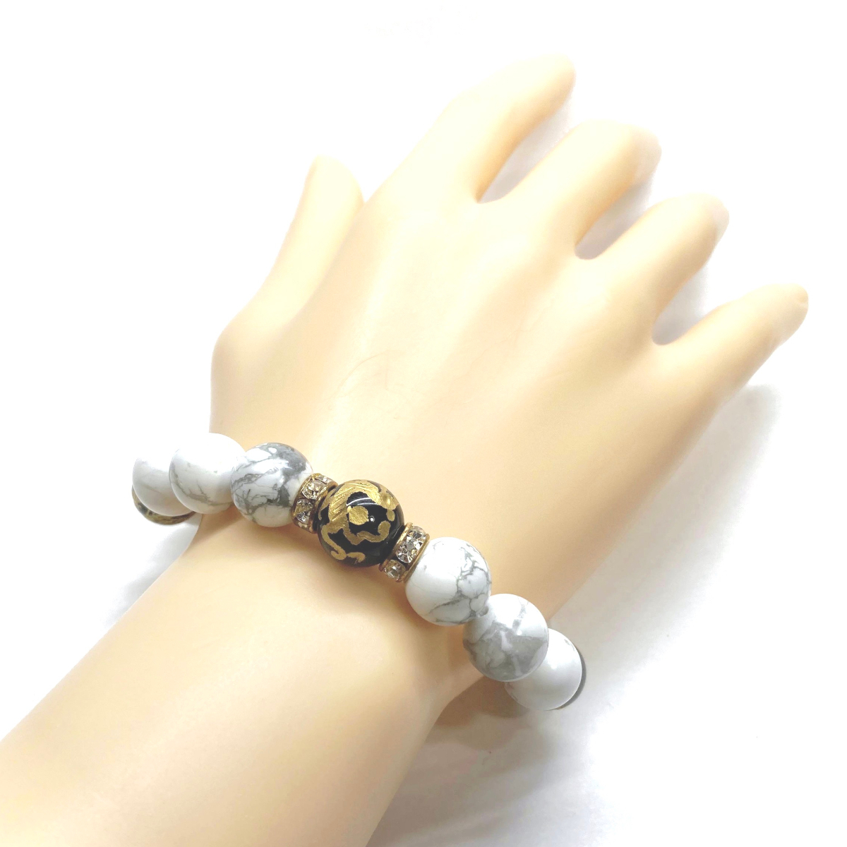 こちらは、四神獣金彫オニキとハウライトを組み合わせたパワーストーンブレスレットです。四神獣は、中国の伝説で4つの方向(東西南北)を守護する神聖な神。四神獣、厄災から身を守り、多くの運気を呼び込むと言われております。石大きさは程よくインパクトのある12mm玉で内周 約17cmです。 数に限りがございますので気になる方はお早めにどうぞ。