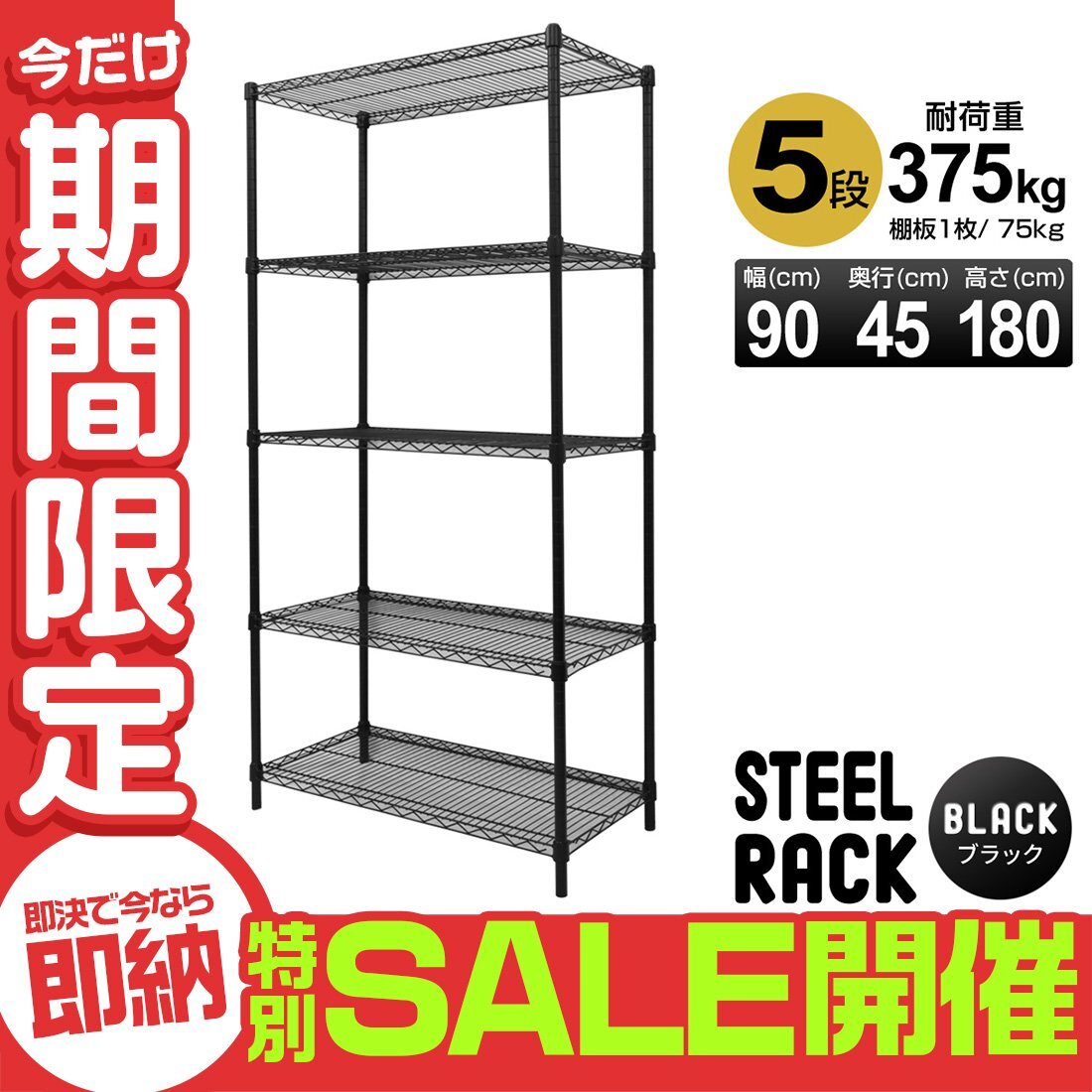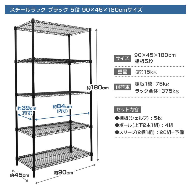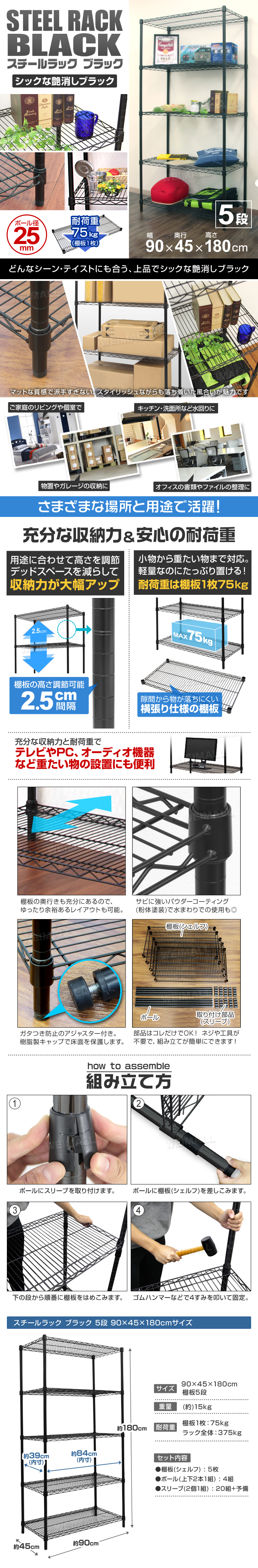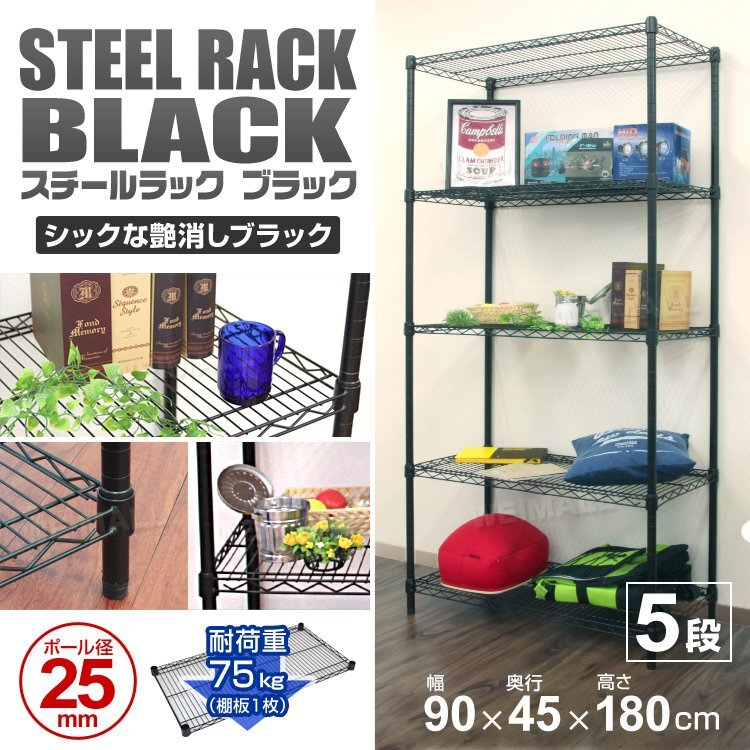 | どんなお部屋にも合わせやすいスチールラックです。 ぐらつき防止アジャスター付き! クギやネジを使わずに簡単に組み立て出来ます! 棚の高さを自由に変えることができます。 一人暮らしのお部屋やリビング、キッチン、物置など場所を問わず活躍できます。 錆に強いパウダーコーティングで水回りでの使用も◎ アパレルショップの店頭用やオフィスにも使用されています。 【仕様】 サイズ(約):幅90×奥行45×高さ180cm 耐荷重(約):(全体)375kg / (棚板1枚あたり)75kg 材質:スチール(クロームメッキ)、ABS樹脂他 重量(約):15kg カラー:ブラック 【商品内容】 シェルフ(棚板) ×5 ポール(上下2本1組) ×4 スリーブ(2個1組) ×20(+予備付属) 【もちろん新品未使用品です】 |