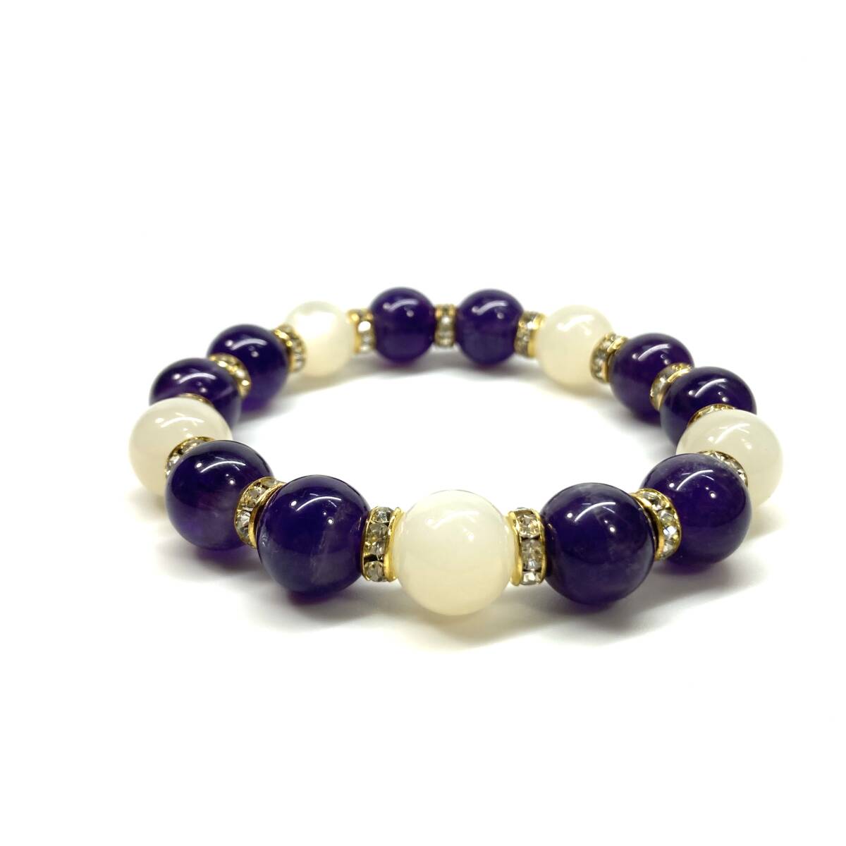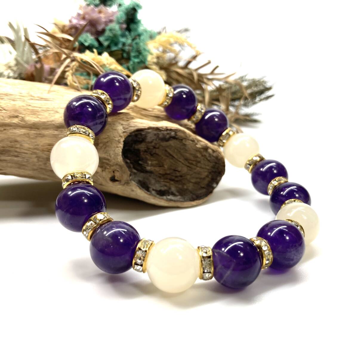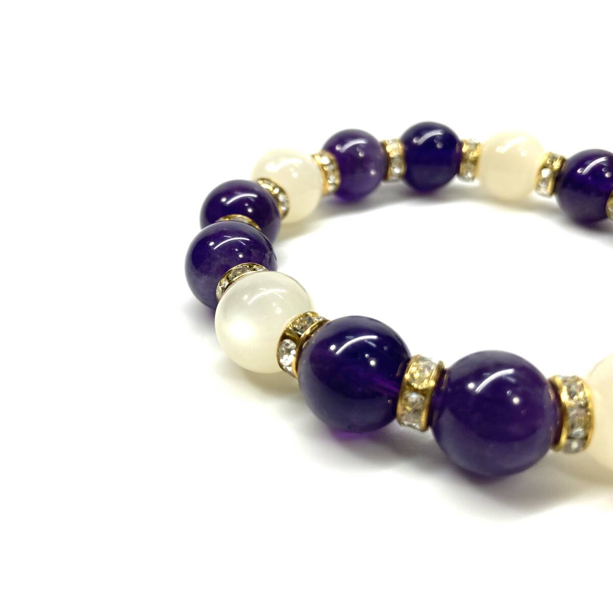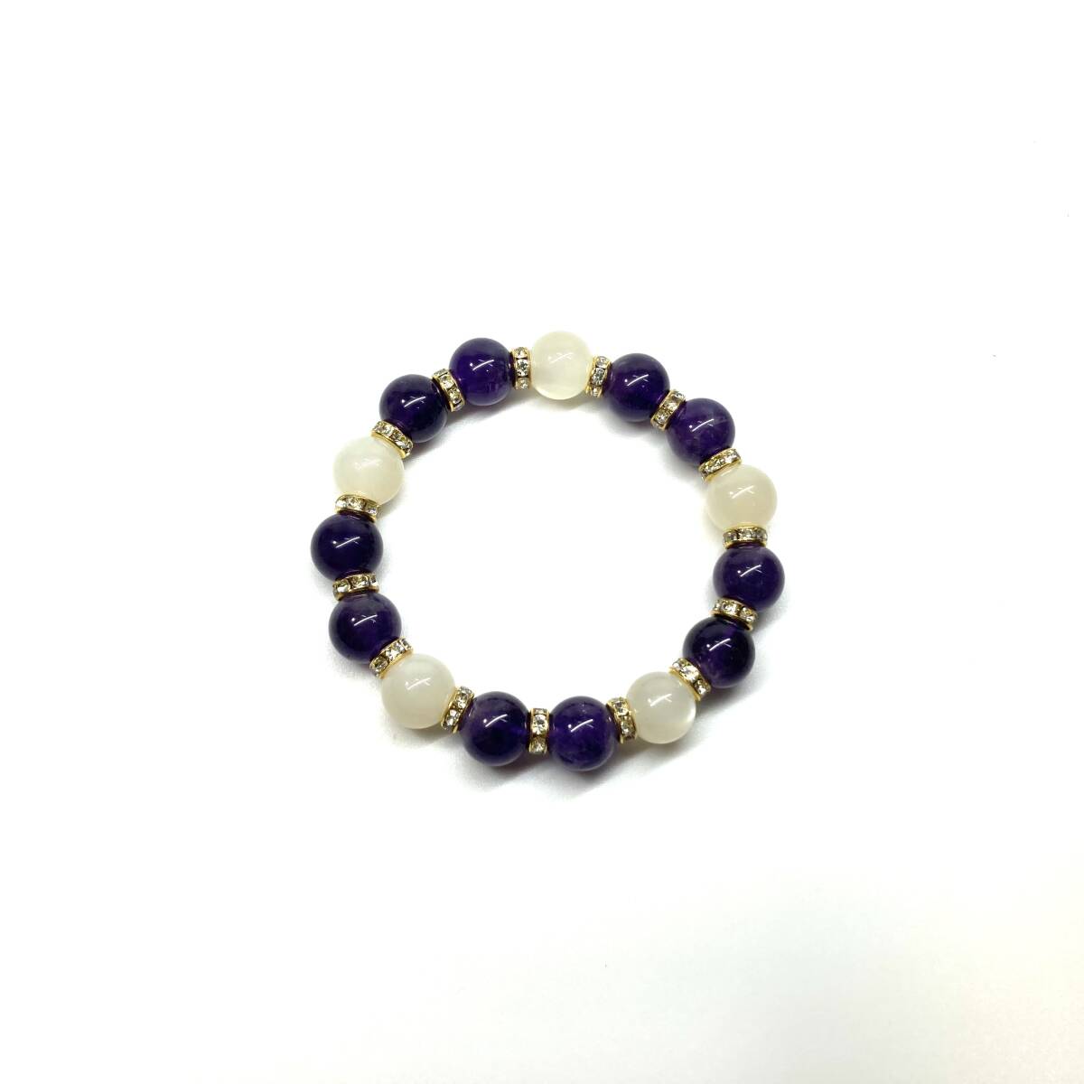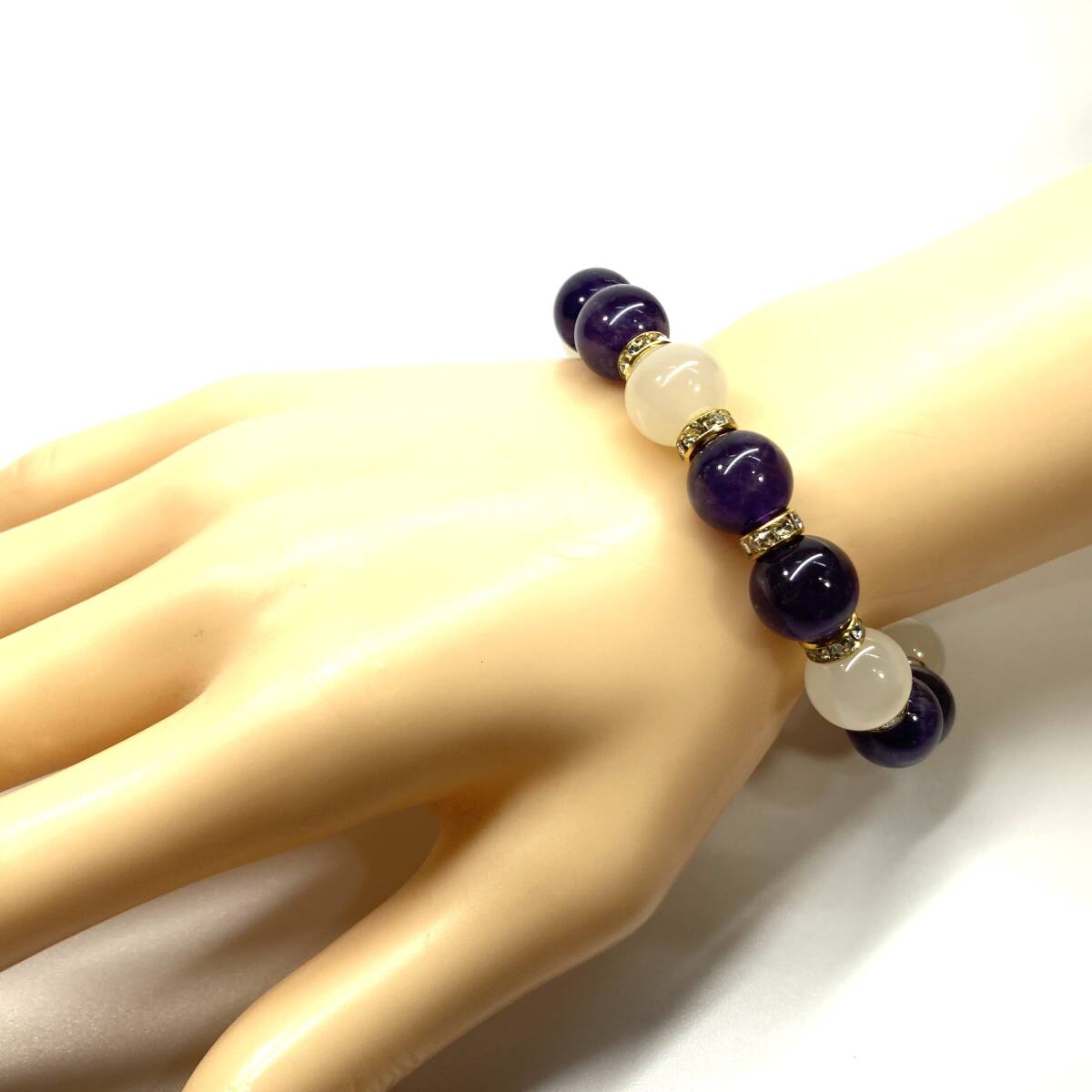 こちらは、ムーンストーンとアメジストを組み合わせたパワーストーンブレスレットです。間にはロンデルを挟み高級感あるデザインに仕上げております。石大きさは12mm玉を使用して内周約18cmです。気になる方は是非この機会にどうぞ。