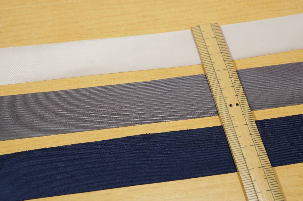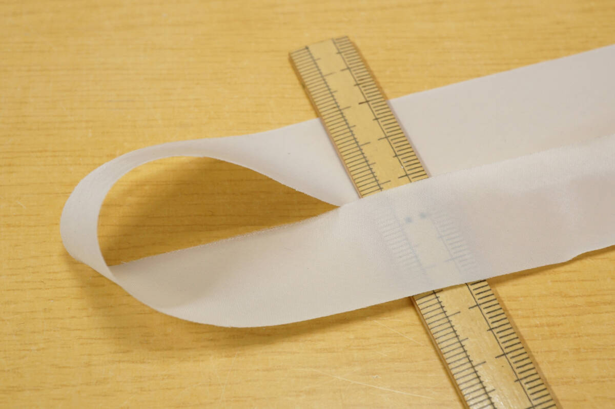 色調:紺・モカグレージュ・淡ベージュの3色、ポリエステル素材の折り加工されていない平らなバイアステープで、アイロンで折り目をつけたり、「バインダーやラッパ(ミシン用アタッチメント)」を使用して縫製するテープになります。
