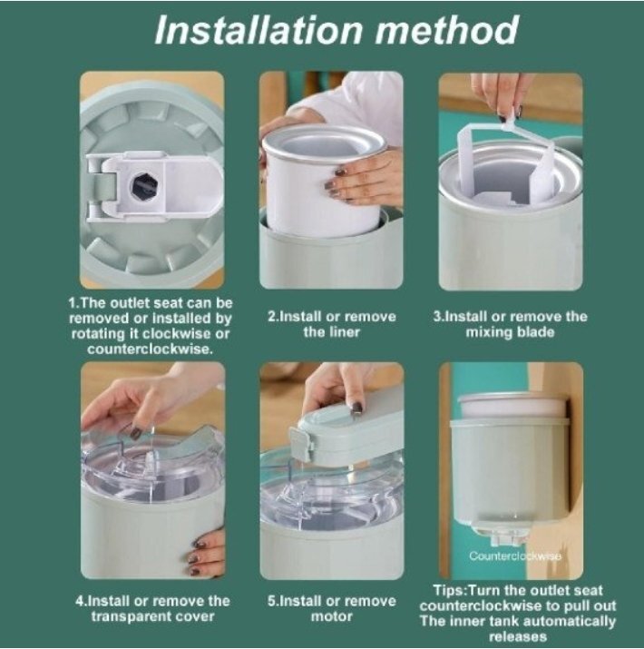 【簡単な操作】:材料を混ぜ、材料を準備し、ボウルに入れてよく混ぜます。ソフトクリームメーカーの電源を入れたら、混ぜた材料を内容器に注ぎます。約10分間かき混ぜ、スイッチを入れてアイスクリームを転がします。