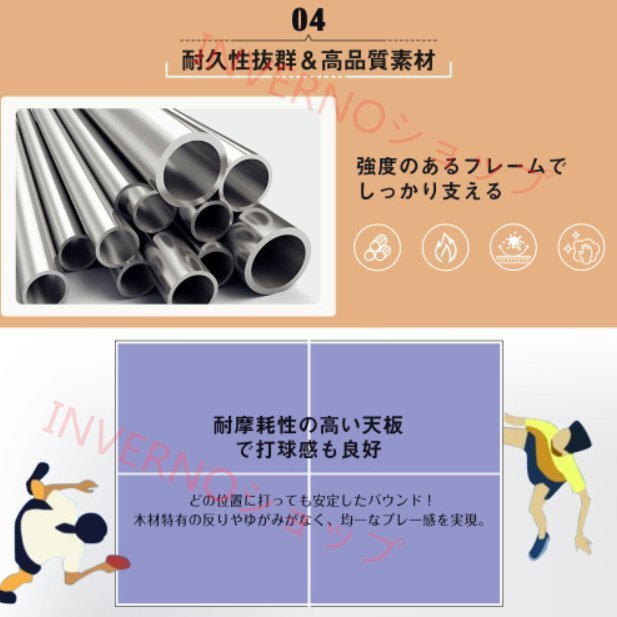 • ④高品質素材&抜群の耐久性|強度のあるスチールフレームがしっかり支え、耐摩耗性の高い天板で快適な打球感を実現。木材特有の反りやゆがみがなく、どの位置でも安定したバウンド。