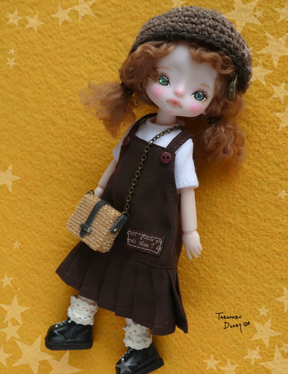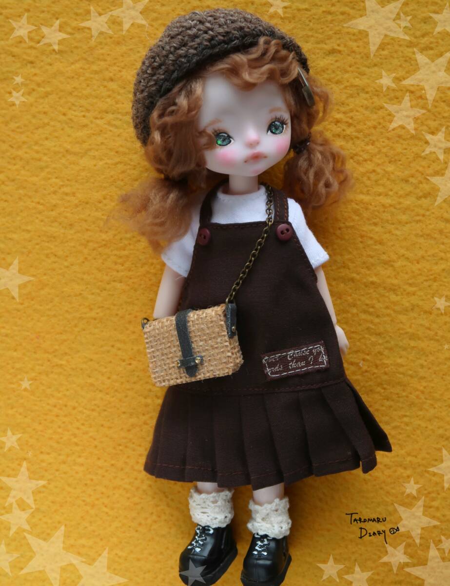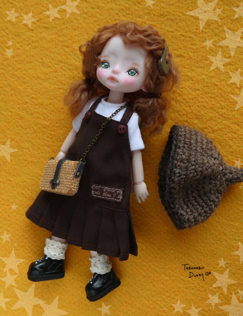1体の出品です。ドール本体と、焦げ茶色のジャンパースカート、Tシャツ(市販品)、とんがり帽子、レッグウォーマー、靴(市販品を加工)、バッグ(開きません)、パッチン留め がお譲りするものです。市販品のお箱に入れて発送いたします。