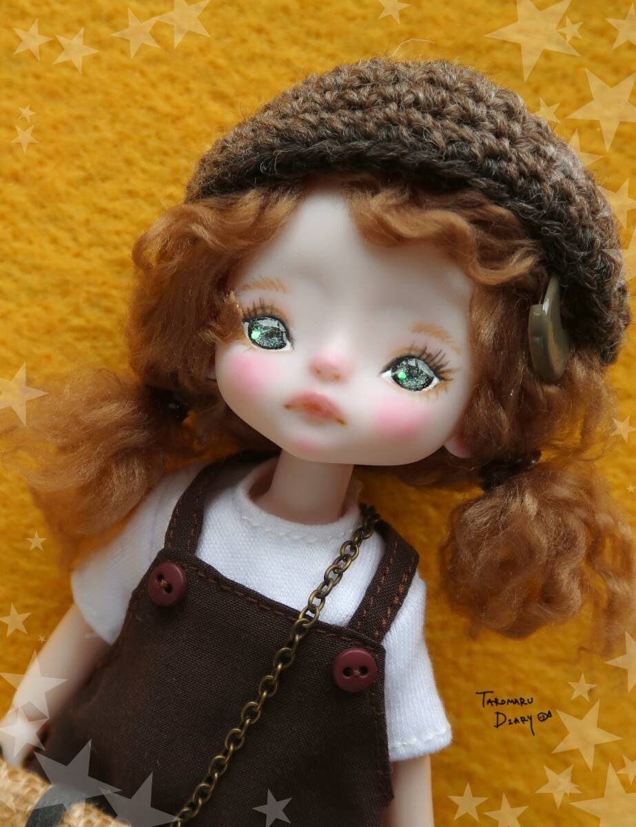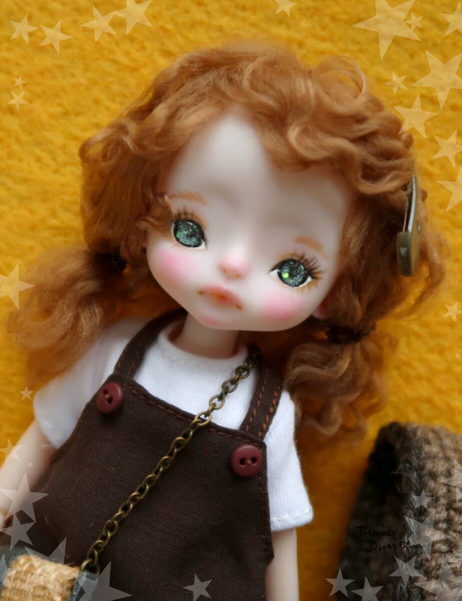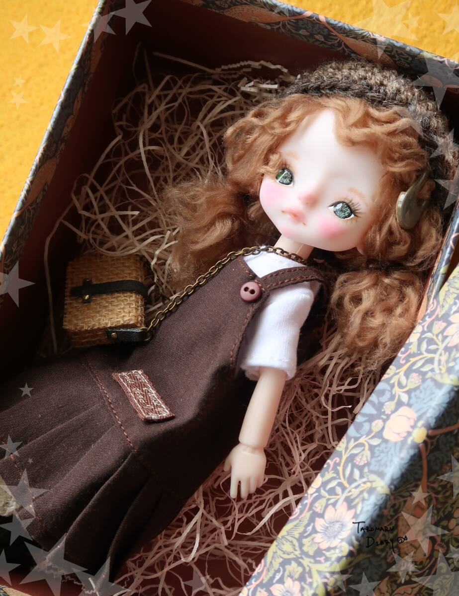 1体の出品です。ドール本体と、焦げ茶色のジャンパースカート、Tシャツ(市販品)、とんがり帽子、レッグウォーマー、靴(市販品を加工)、バッグ(開きません)、パッチン留め がお譲りするものです。市販品のお箱に入れて発送いたします。