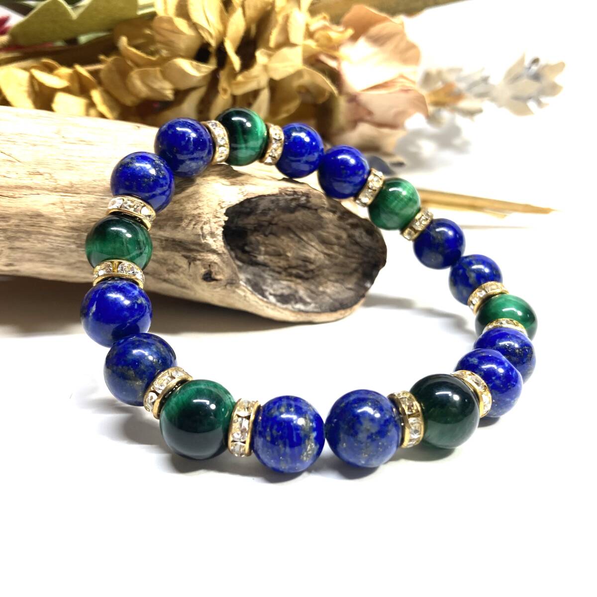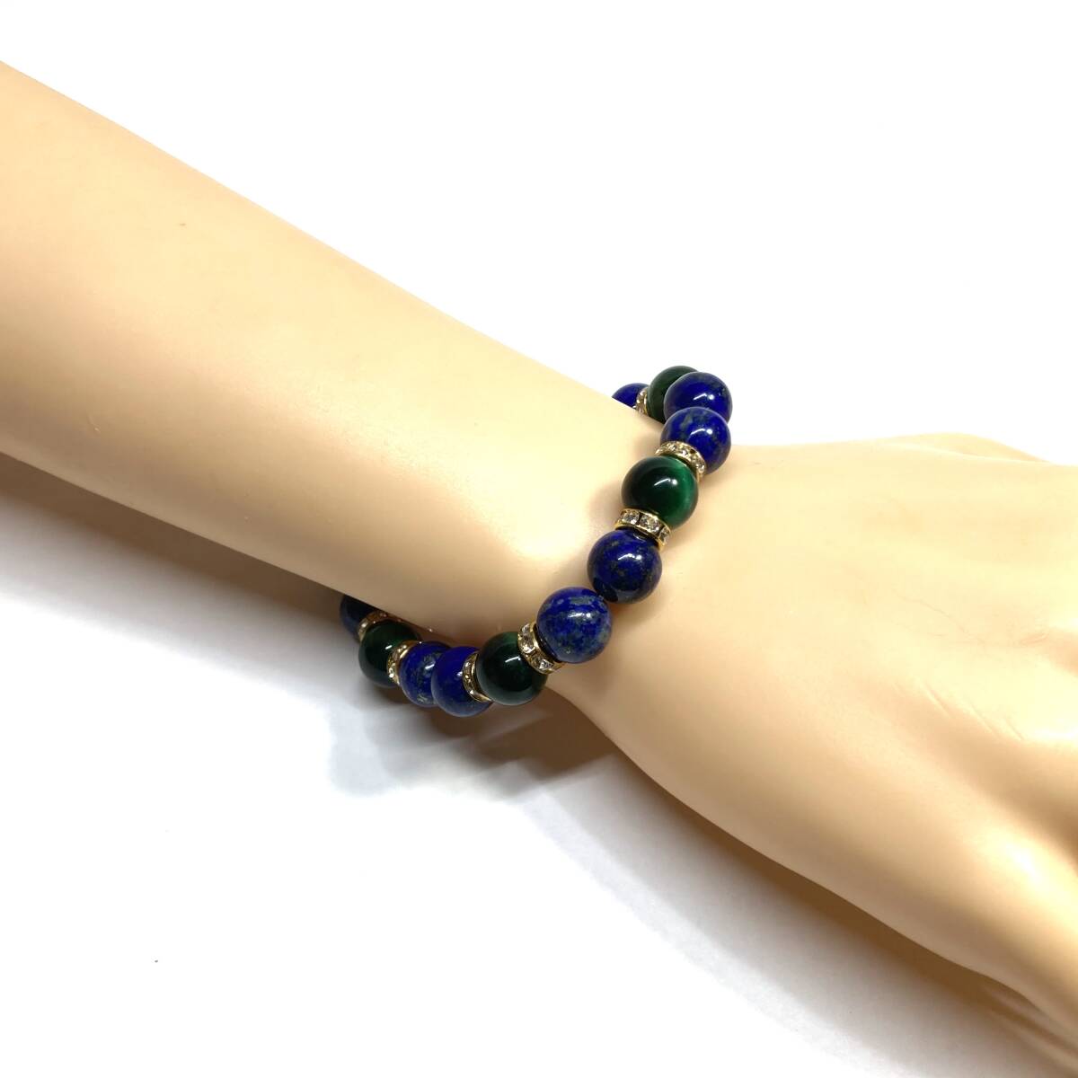 こちらは、ラピスラズリとグリーンタイガーアイを組み合わせたパワーストーンブレスレットです。間にはロンデルを挟み高級感あるデザインに仕上げております。石大きさは腕にも馴染みやすいように10mm玉で内径約18cm(伸可能)です。(サイズ変更の場合は取引ナビにてご連絡をお願いします。) 数に限りがございますので気になる方はお早めにどうぞ。