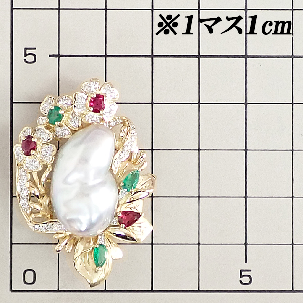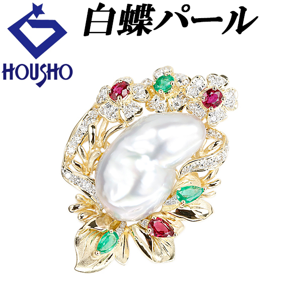 【セール開催中】白蝶真珠(南洋真珠) ブローチ ダイヤモンド ルビー エメラルド K18YG WG ペンダントトップ フラワー 植物 宝正 902025