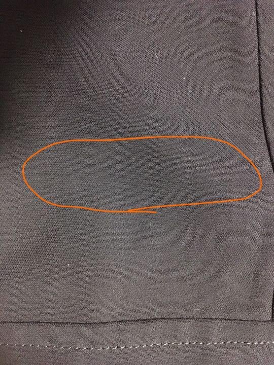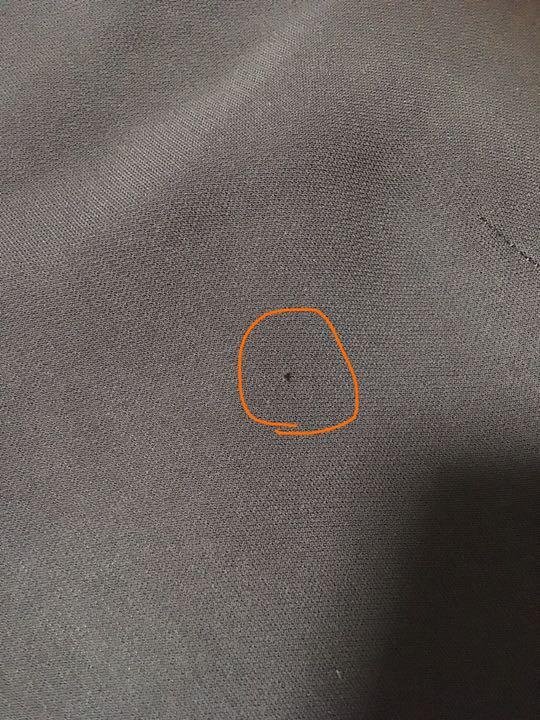 胸下あたりに一箇所毛ほつれが、前側恥骨あたりの箇所に引っかき傷のような細い線(糸抜け)がございます。細い線につきましては30センチも離れると見えないレベルです。画像参照下さい。