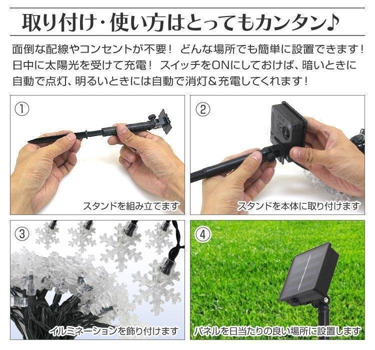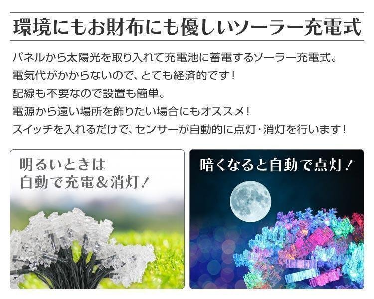 | ソーラーパネルで充電するので、電源不要で電気代0円! 経済的でエコなイルミネーションです。 暗くなると自動で点灯、明るくなると自動で消灯する明るさセンサー付きなのでとても便利! 使用しない場合は電源をOFFにしておけば暗くなっても光りません。 電源をコンセントから取らなくていいので、 日の当たるソーラーパネルを置くスペースさえあればどこでも楽しむことが出来ます。 お庭の植え込みに、テラスやベランダに! クリスマスイルミネーションにピッタリ!ハロウィンもピッタリです♪ ■商品コード:ACA04070 種類:雪の結晶 サイズ(約): ・ソーラー本体:7.2×7.2×2.3cm ・支柱:21.5cm 重量(約):270g LED数:50球 点灯パターン:2パターン(常時点灯、点滅) フル充電時点灯時間:最大8時間 ※時間は目安で、使用環境により異なります。 充電時間5~8時間 ※環境により充電時間は伸びます。 カラー:ミックスカラー(ブルー、レッド、グリーン、イエロー) ソーラーパネル:2V/100mA バッテリー:ニッケル水素電池(NiMH) 600mAH 電源から電球までの長さ(約):2m コードの長さ(約):7m コードの色:ダークグリーン 防水性能:防水 防滴型 連結不可 ■注意事項 ・点灯時間は、お使い頂く地域、設置場所、季節や天候の日照条件に左右されます。 日照時間が短い場合、必要な電力が充電できず、点灯時間が短くなることがあります。 ・夜間、周囲が明るくなる場所に設置すると、照度センサーが感知せず点灯しない場合があります。 ・防雨構造となっておりますが、常時水のあたる場所や水中等、極端な使用はしないで下さい。 故障の原因になりますのでご注意下さい。 ・商品の特性上色のバラツキ、明るさが多少異なる場合がございます。予めご了承お願いします。 ・LED不良率5%以下につきましては保証対象外とさせていただきます。 ・入荷時期により、多少色味が異なる場合がございます。初期不良対象外となりますのでご了承下さい。 ・写真と実物は多少異なる場合がございます。あらかじめご了承下さい。 ■保障期間 7日間 ※商品到着後7日以内の初期不良・破損のみご対応させていただきます。 【もちろん新品未使用品です】 |