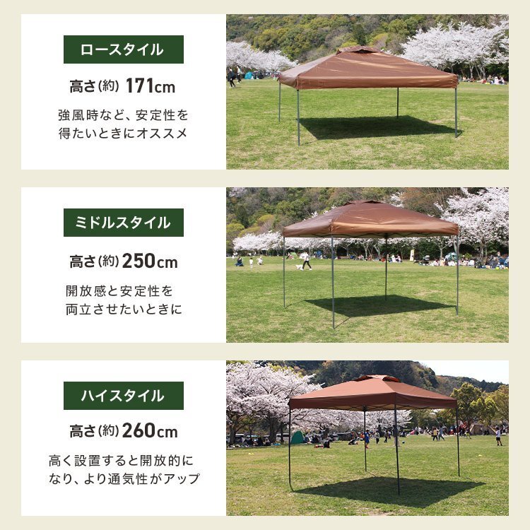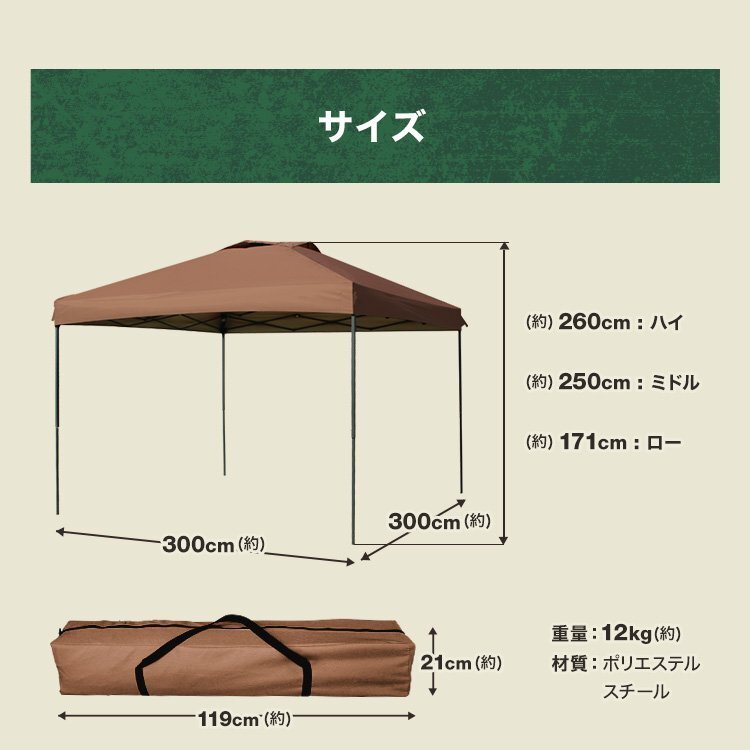 | 日よけで、直射日光から守る! ワイドなサイズ300×300cmのワンタッチタープテントです。 組み立てはワンタッチで簡単! 大人2人で持ち上げてゆっくり広げるだけ! フレームは強度で耐久性のあるスチール製を採用! アルミ製より少し重いですが、強度で安定性があります!! トップカバー上部には風抜けのベンチレーションを装備! テントの内側にたまる空気が通り抜け、風による倒壊事故対策になります。 風の強い日も安心! 急な雨が降っても安心の撥水加工が施されており、 大人数のバーベキューやスポーツ観戦、アウトドア、休憩所にぴったり。 シーンに合わせて3段階で高さ調節が可能です。 持ち運びに便利な専用収納バック付き! ■商品コード:ODTT11GR ■商品仕様 カラー:グリーン 本体サイズ:(約)300cm×300cm×171~260cm 収納時サイズ:(約)119cm×21cm 本体重量:(約)12kg 材質:ポリエステル、スチール ■内容 タープテント本体 ロープ ×4 ペグ ×8 専用収納ケース ■注意事項 ・テント生地には撥水加工が施されていますが、雨天・豪雨下での完全防水を保証するものではございません。 ・風速5m以上の風の吹く場所でのご使用は、転倒や破損の原因になります。 ・設営の際は、2人以上で丁寧に作業を行い、しっかりと固定してください。 乱暴に扱いますと、故障や破損の原因になります。 ・海外製品で、簡易梱包での輸入のため風防に擦れや多少の小キズなどがある場合がございますが、 商品自体には問題ありませんのでご了承下さい。 ・商品は、モニターによって色合いが異なって見える場合があります。 ・仕様・デザインは改良のため予告なく変更することがあります。 ■保障期間 7日間 ※商品到着後7日以内の初期不良・破損のみご対応させていただきます。 【新品未使用品です】 |