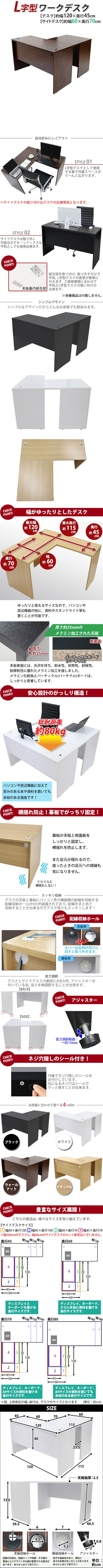 | 商品紹介 | ■作業スペースを広く確保出来る、L字型ワークデスクです。 ■サイドデスクの幅が約60cmのタイプです。 ■会議室や事務所等、オフィス家具として様々なシーンでお使いいただけます。 ■天板には、メラミン加工を施しています。 ■幕板が天板と側面板をがっちりと固定!横揺れを防止します。 ■ネジ穴隠しのシール付き。 ■デスクの天板と幕板に配線収納ホールが2カ所ずつ備わっています。 ■アジャスターで高さの調節が可能です。(高さ調節範囲〜約15mm) ※こちらの商品は、組立て式です。組立てにはプラスドライバーが必要です。お客様でご用意ください。 ※組立図が付属します。 ※サイドデスクの取り付けはデスクの左側専用となります。 ■材質:パーティクル(パーチクル)ボード(メラミン加工)(本体、サイドデスク)、プラスチック(アジャスター、配線収納ホール) ■重量:約39kg(デスク:約23kg、サイドデスク:約16kg) ■総耐荷重:約80kg ●新品商品ではありますが、輸入商品の為、多少の擦り傷などがある場合がございますので、ご納得の上ご購入下さいませ。 ●ご購入後、お客様ご都合によるご返品、ご返金等は一切お受け致しておりません。 ●本商品を使用した際に発生したトラブル、事故につきまして、当社は一切の責任を負いません。ご使用に関しましては、全て自己責任にてお願い致します。 ※カラーはウォールナットとなります。 |
