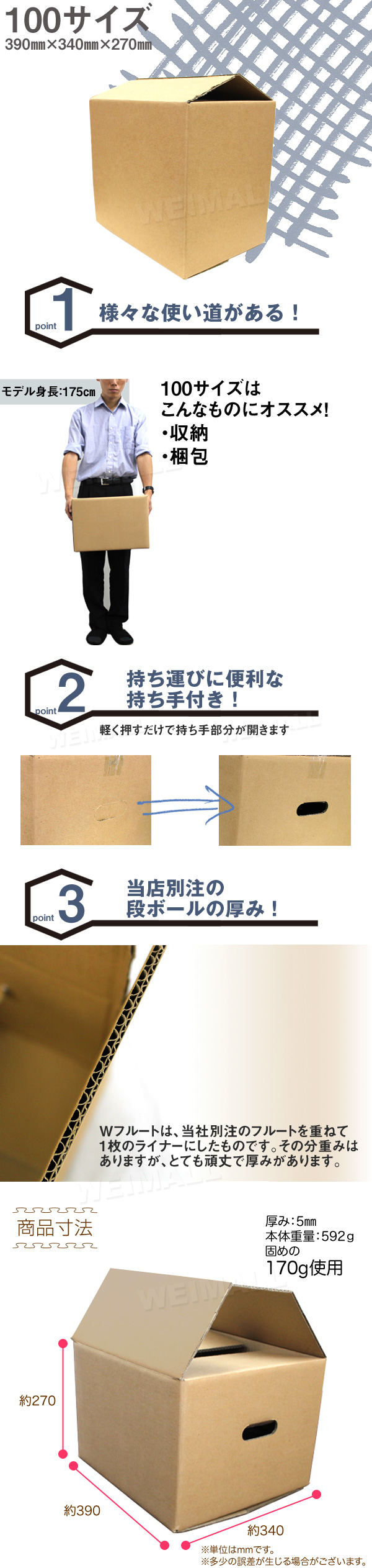 商品の配送、オークション宅配などに便利な 100サイズのダンボール箱です。 ほかにお部屋の整理整頓などにご活用ください。 |