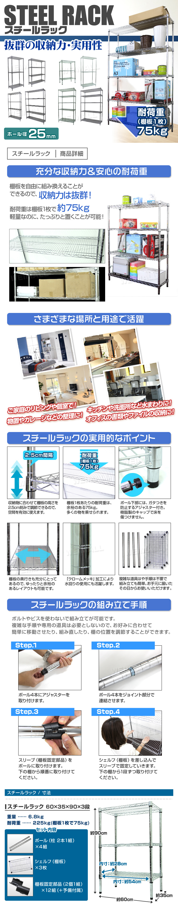 ぐらつき防止アジャスター付き! クギやネジを使わずに簡単に組み立て出来ます! 棚の高さを自由に変えることができます。 一人暮らしのお部屋やリビング、キッチン、物置など場所を問わず活躍できます。 アパレルショップの店頭用やオフィスにも使用されています。 ■商品仕様 サイズ(約):幅60×奥行35×高さ90cm 耐荷重(約):(全体)150kg / (棚板1枚あたり)50kg 材質:スチール(クロームメッキ)、ABS樹脂他 重量(約):6.8kg カラー:シルバー ■商品内容 シェルフ(棚板) ×3 ポール(ジョイント式) ×4 棚板固定部品 ×12(+予備付属) 標準アジャスター(固定足) ×4 ■注意事項 ・海外製品で、簡易梱包での輸入のため風防に擦れや多少の小キズなどがある場合がございますが、商品自体には問題ありませんのでご了承下さい。 ・商品は、モニターによって色合いが異なって見える場合があります。 ・仕様・デザインは改良のため予告なく変更することがあります。 |
