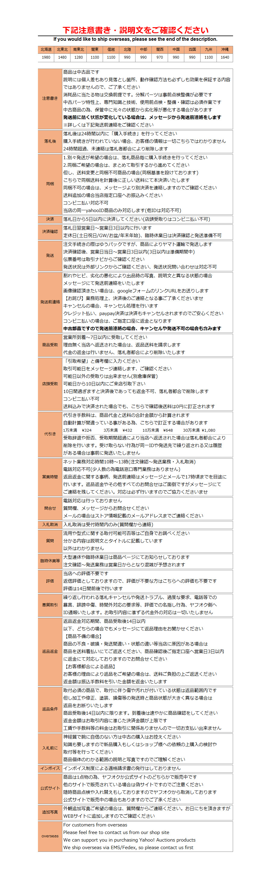 Ⅲ.一旦成功中标,您必须全额支付该拍品(成交价+消费税+银行转账费+日本邮费+代购费)。