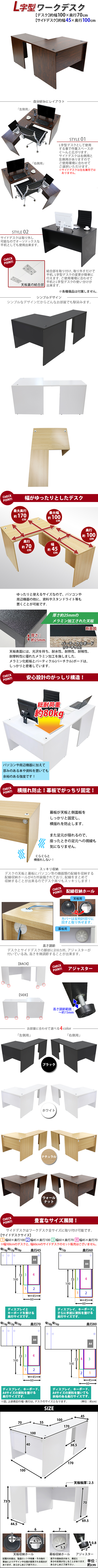 | 商品紹介 | ■作業スペースを広く確保出来る、L字型ワークデスクです。 ■サイドデスクの幅が約45cmのタイプです。 ■会議室や事務所等、オフィス家具として様々なシーンでお使いいただけます。 ■天板には、メラミン加工を施しています。 ■幕板が天板と側面板をがっちりと固定!横揺れを防止します。 ■ネジ穴隠しのシール付き。(サイドデスクのみ付属) ■デスクの天板と幕板に配線収納ホールが2カ所ずつ備わっています。 ■アジャスターで高さの調節が可能です。(高さ調節範囲〜約15mm) ※こちらの商品は、組立て式です。組立てにはプラスドライバーが必要です。お客様でご用意ください。 ※組立図が付属します。 ※サイドデスクの取り付けはデスクの右側専用となります。 ■材質:パーティクル(パーチクル)ボード(メラミン加工)(本体、サイドデスク)、プラスチック(アジャスター、配線収納ホール) ■重量:約44kg(デスク:約28kg、サイドデスク:約16kg) ■総耐荷重:約80kg ●新品商品ではありますが、輸入商品の為、多少の擦り傷などがある場合がございますので、ご納得の上ご購入下さいませ。 ●ご購入後、お客様ご都合によるご返品、ご返金等は一切お受け致しておりません。 ●本商品を使用した際に発生したトラブル、事故につきまして、当社は一切の責任を負いません。ご使用に関しましては、全て自己責任にてお願い致します。 ※カラーはウォールナットとなります。 |