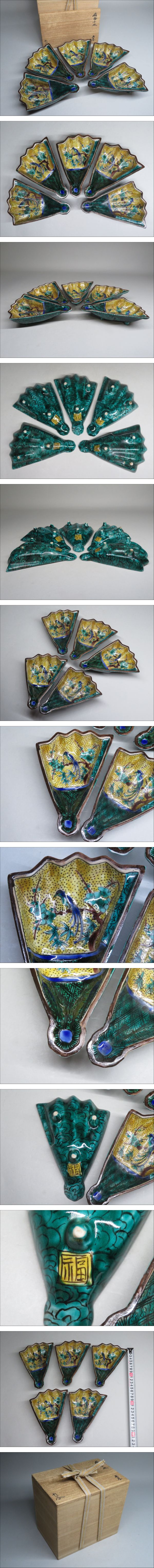 | 「コレクター所蔵品」◆九谷 青手扇面形花鳥図 向付 扇形皿 五客揃 箱付 角福 ◆検:伊万里焼/有田焼/鍋島焼l | ||