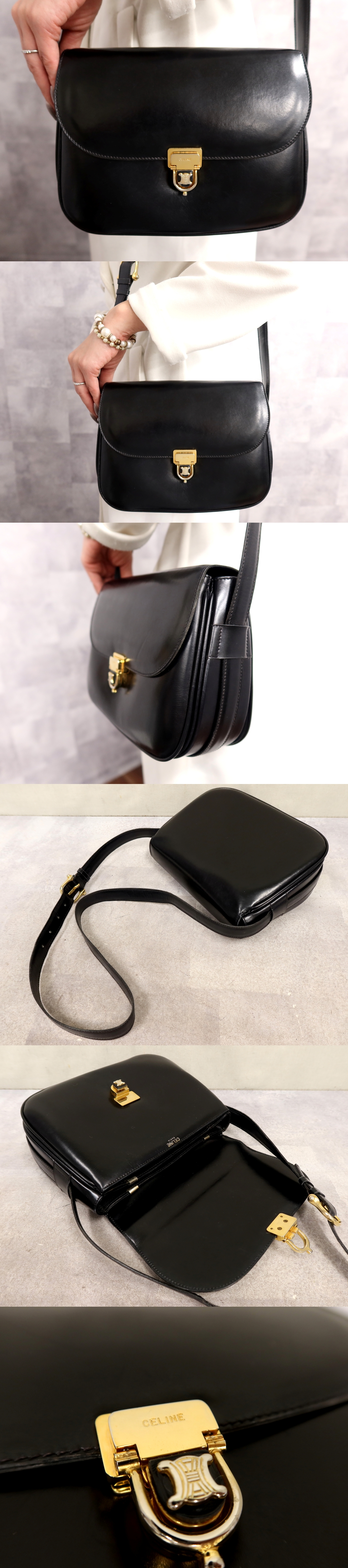 ●美品●CELINE セリーヌ●フラップ●カーフ レザー 本革●ショルダー バッグ●黒●ゴールド金具●肩掛け●ヴィンテージ●かばん●Js64750