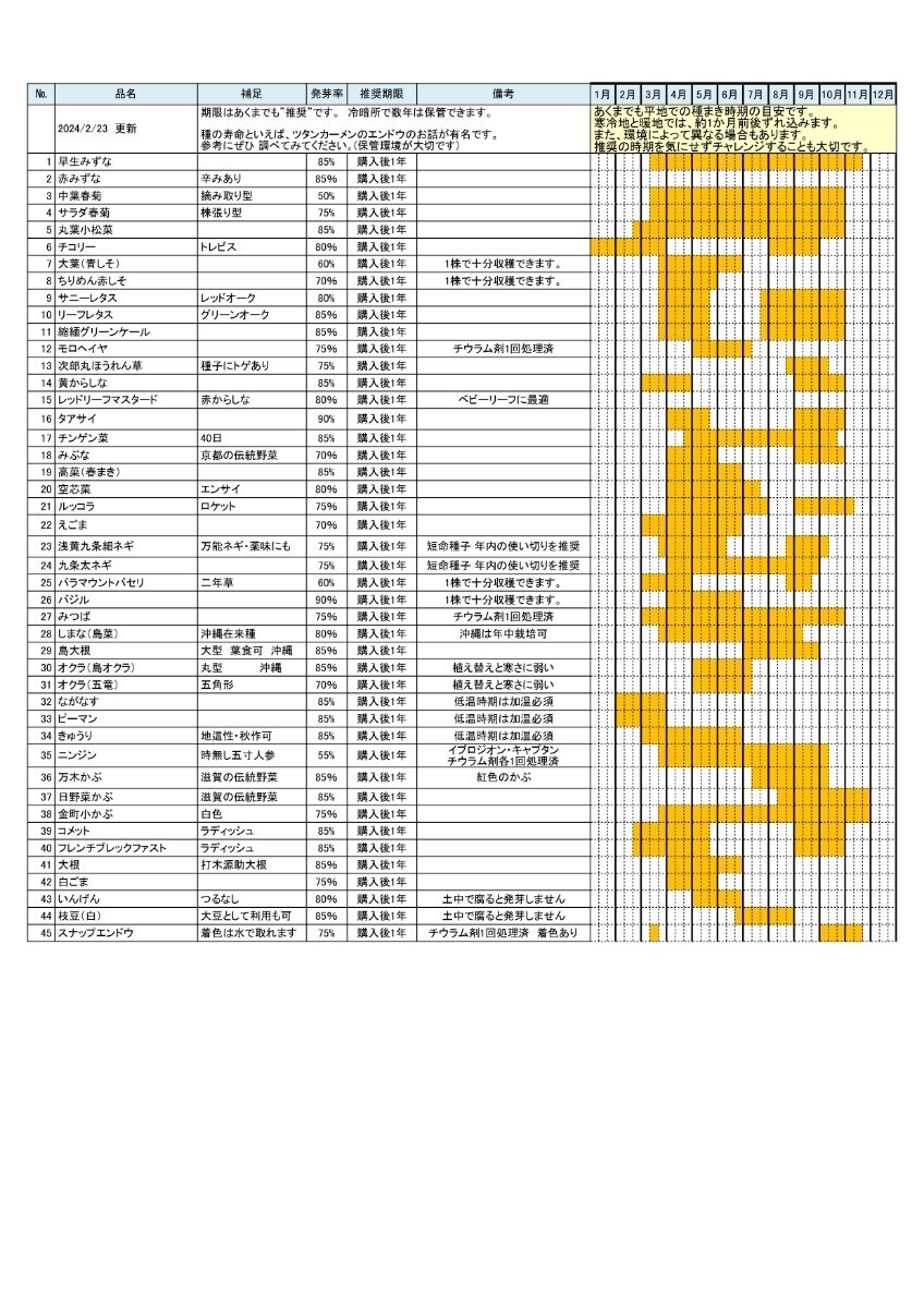 /ニンジン/白ごま/チコリー/九条太ネギ/チンゲン菜/大葉(青しそ)/ちりめん赤しそ/パラマウントパセリ/セロリ/万木かぶ/バジル/高菜(春まき)/空芯菜/日野菜かぶ/タイム/えごま/島大根/島オクラ/しまな(島菜)/オクラ(五竜)/枝豆(白)/大根/モロヘイヤ/ながなす/ピーマン/きゅうり/ミニトマト(矮性)/いんげん