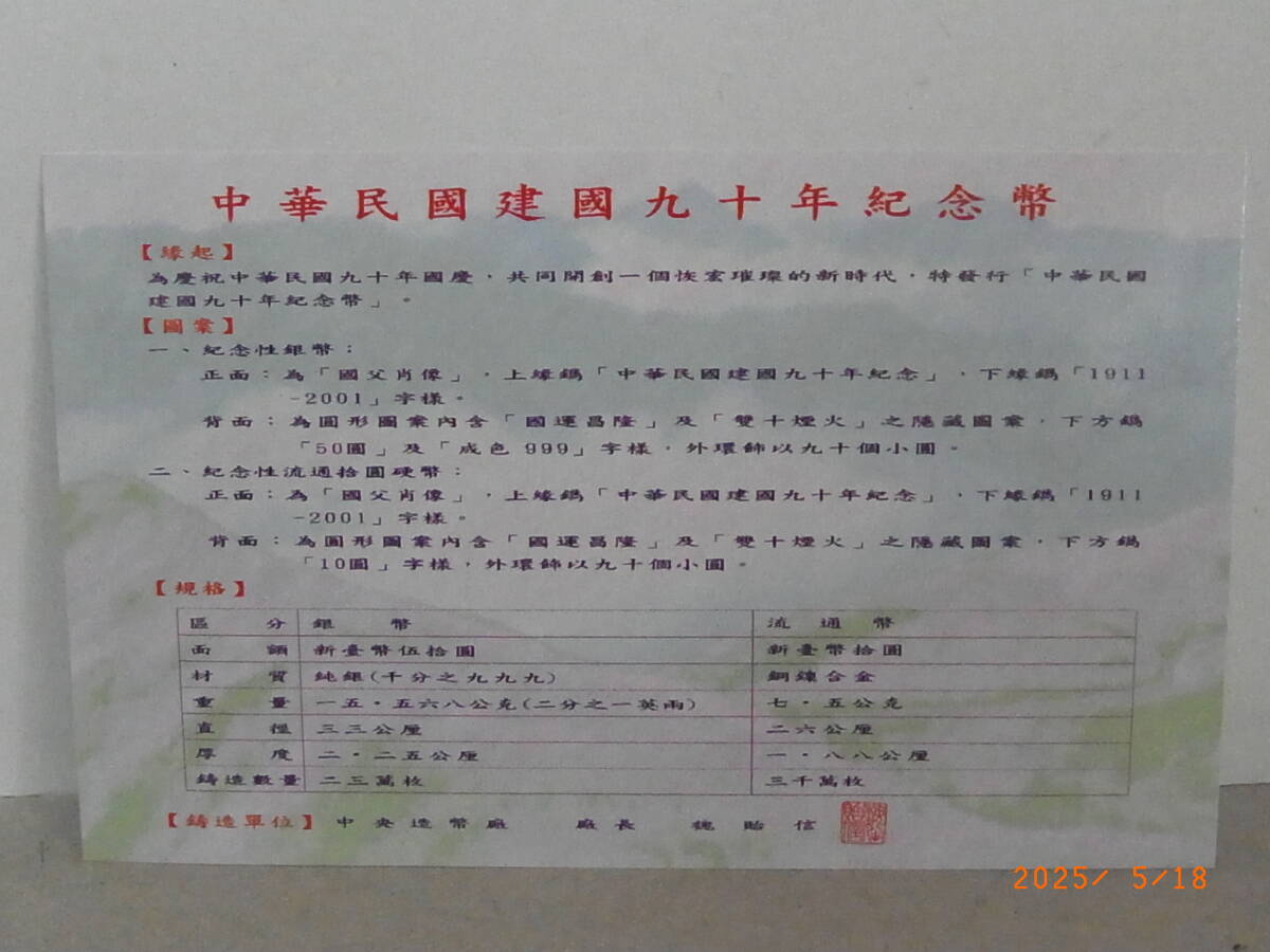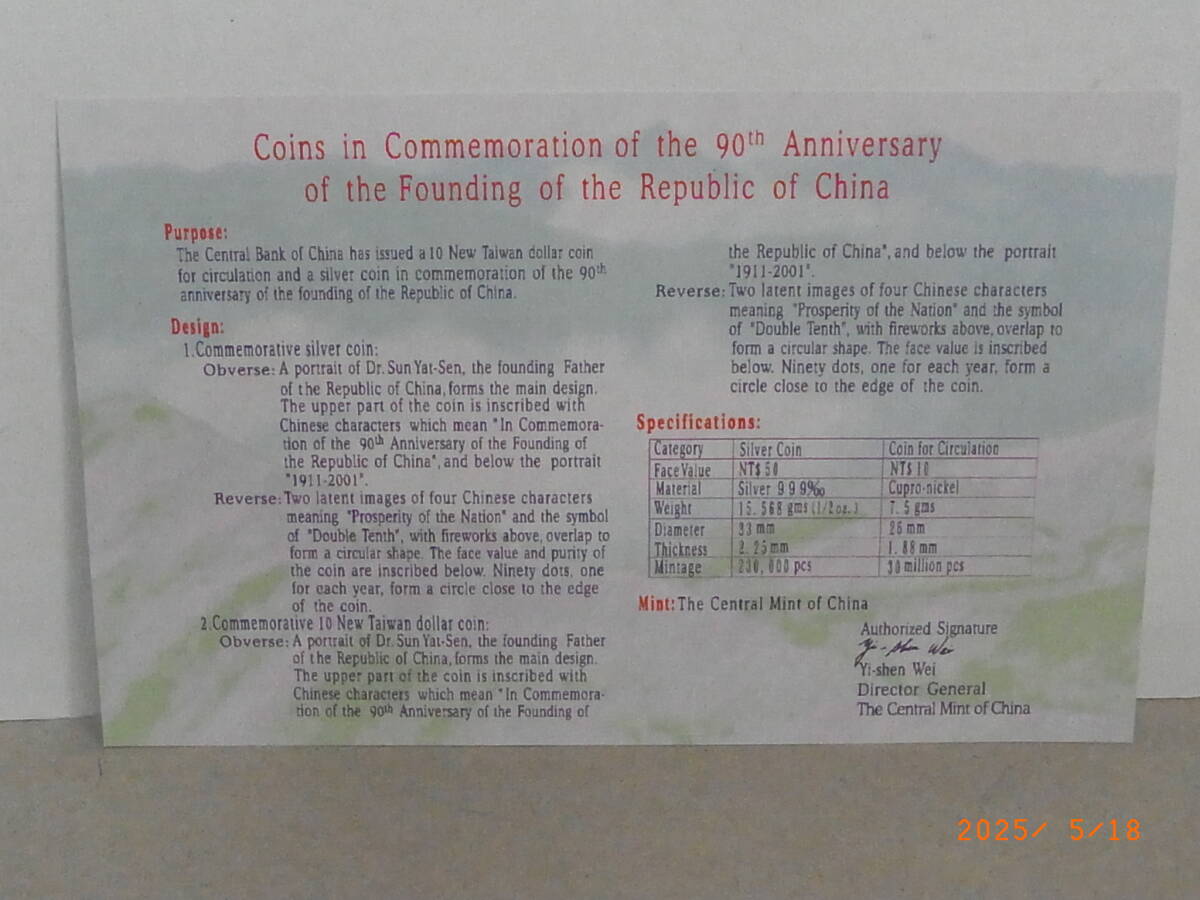 コ イ  ン    中華民国・中央造幣局2001年・建国90年記念貨幣セット【大型50圓銀貨入り】です。