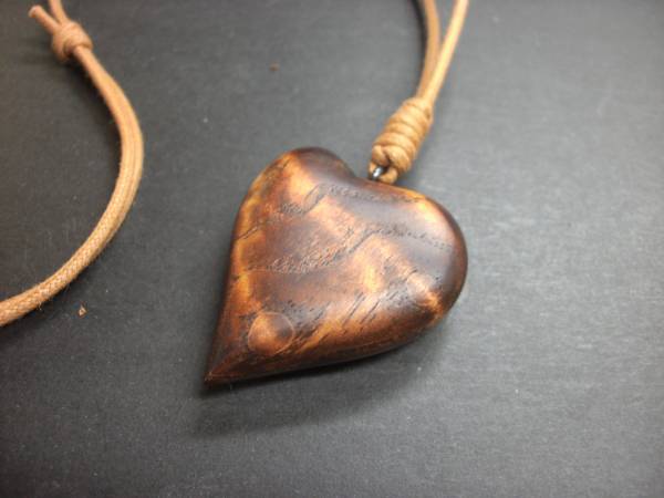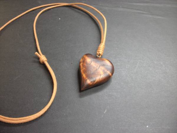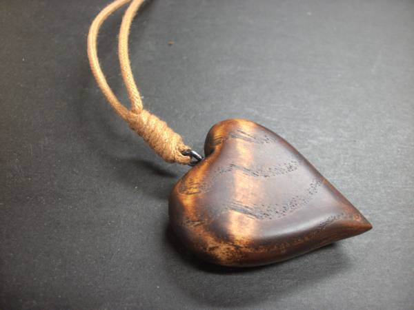 タモの玉杢を使ってハート型のペンダントを作りました。めったにないタモの玉杢がきれいに出て、魅力的なペンダントに仕上げました。