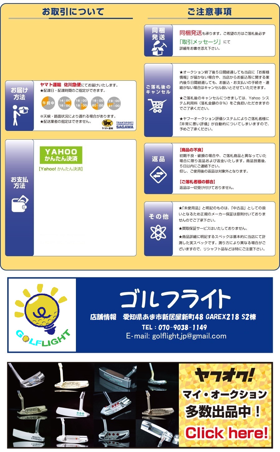 「写真のイメージとちょっと違ったな…」 「落札してみたもののやっぱり使わないや…」 そんなあなたに「研磨パター」に限り、商品到着日より7日以内に同封する書類に必要事項をご記入の上、 「到着した商品」「返金依頼書」を返送頂ければ全額返金を受付いたします。 なお返金期間を過ぎている場合、ご使用の痕が見られる場合に関しましては 返金対応ができませんのでご了承ください。 【ご返金の手順】 1)商品発送の際、同封致します「返金依頼書」に必要事項をご記入の上、捺印をしてください。 2) 「到着した商品」「返金依頼書」を下記住所にご返送ください。ご返送時の配達伝票のお控えは、 荷物追跡や当店への到着の際に必要となる場合がありますので、必ずお手元に保管しておいてください。 なお送料はお客様負担(元払い)となります。 (※着払いで発送の場合、送料を差し引いた金額を入金させて頂きます。) 3)「商品」「返金依頼書」 到着後、3営業日以内に指定の口座へ入金いたします。 |