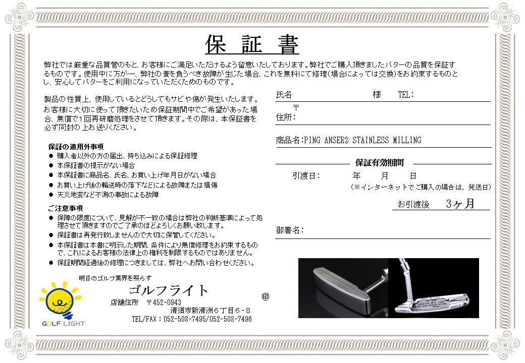 かつてアップル社「iPod」のケースを磨いていた「林工業所」に磨いてもらいました。 磨いている(ミラー仕上げ)ので(メッキ処理をしていない)、打感はかわりません。むしろ、よくなっています。 研磨後は未使用品です。 市販品にはないミラー仕上げですので、人と違ったものを持ちたい、名器をきれいな状態で持ちたい!そんな方向きです。 さらに、フェースにミーリング加工を施しました。古いパターはフェース面の凸凹がありますので普通ミーリング加工をするとキレイに入りません。 「林工業所」協力のもと、一度フェースをさらえ、0.25㎜のミーリング加工をしてあります。 PINGマニア必見、ここしかない、PING のパターです。 ヘッド保護のため、ベビーオイルを塗布し、ガラスコーティングしてあります。 グリップ(PING BLACKOUT)、シャフト(シマダ JSP-70 160g キャメロンタイプ)は新品を装着です。 研磨のため一度ヘッドの抜き差しをしています。古いパターを磨いているので、あくまで中古品とご理解の下、お願い致します。 ※即納ではありません。納期はおおよそ6週間程度かかります。 ※PATPENDかノーマル品かは選ぶことが出来ませんのでご了承のほどよろしくお願いいたします。 | |||
