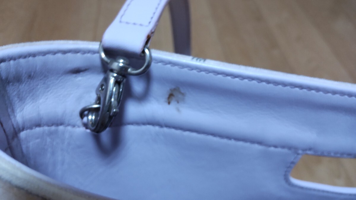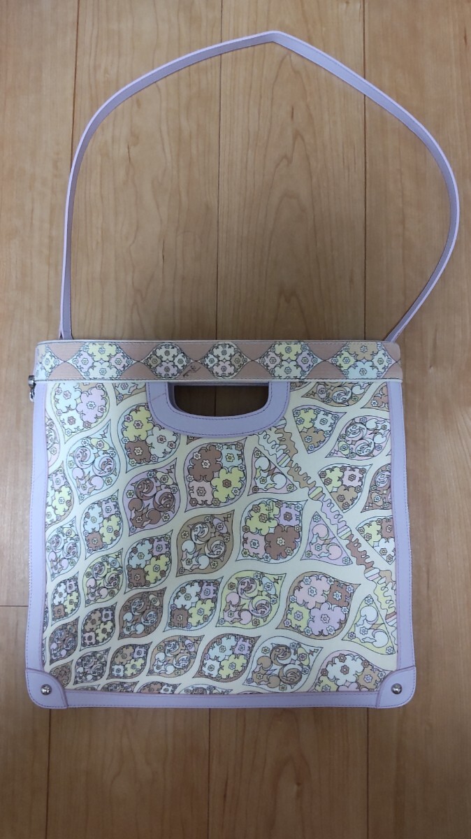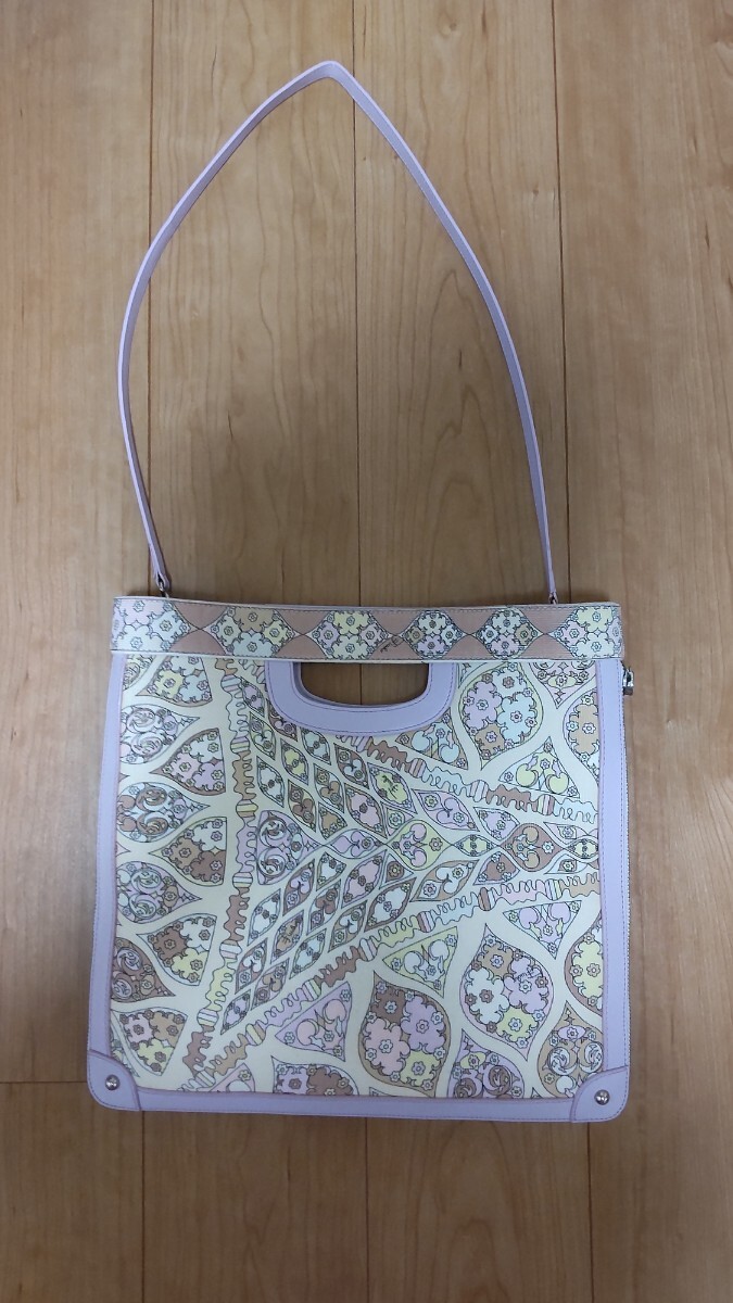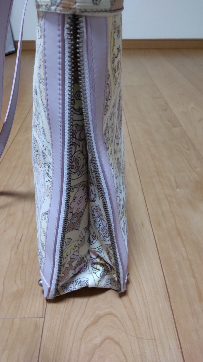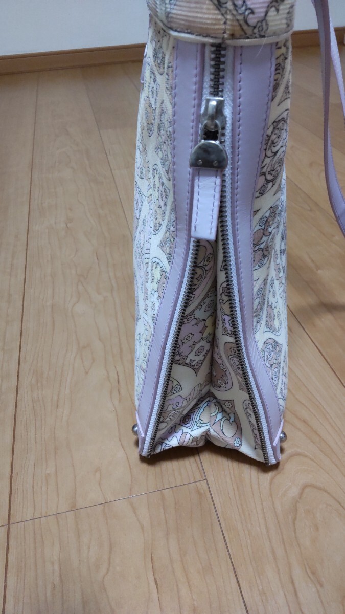 ★かなり前のお品です。★数カ所革の接着剤が溶け出し茶色いシミが数カ所ありますが、それ以外は4〜5回使用したのみで、使用感、擦れや黒ずみも無くキレイな状態です。内側の布も汚れなくキレイです★外のファスナーをグルっと開けるとマチが12センチの大容量バッグになり、通勤にも便利なA4サイズが入ります。★ショルダーストラップをバッグの内側にの金具で付け外し出来ます。斜め掛けも可能。