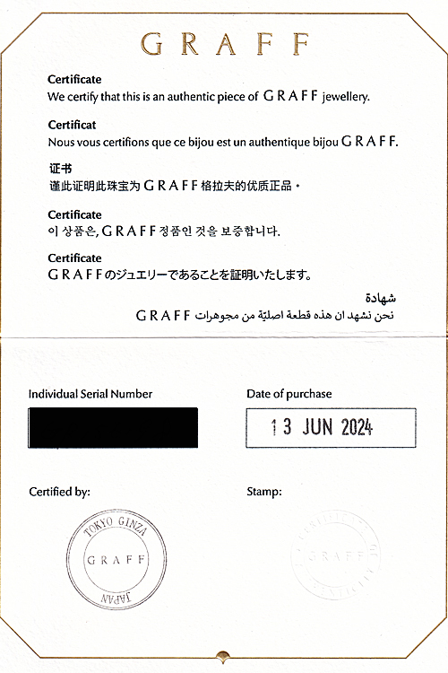 付属品GIA鑑定書(カバーなし、へこみあり)、証明書、外箱(汚れあり)、内箱、封筒(へこみあり)、リボン