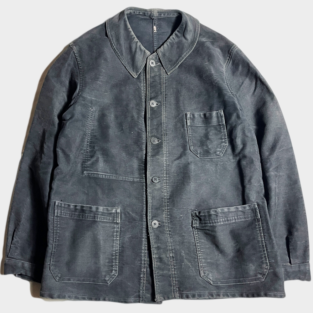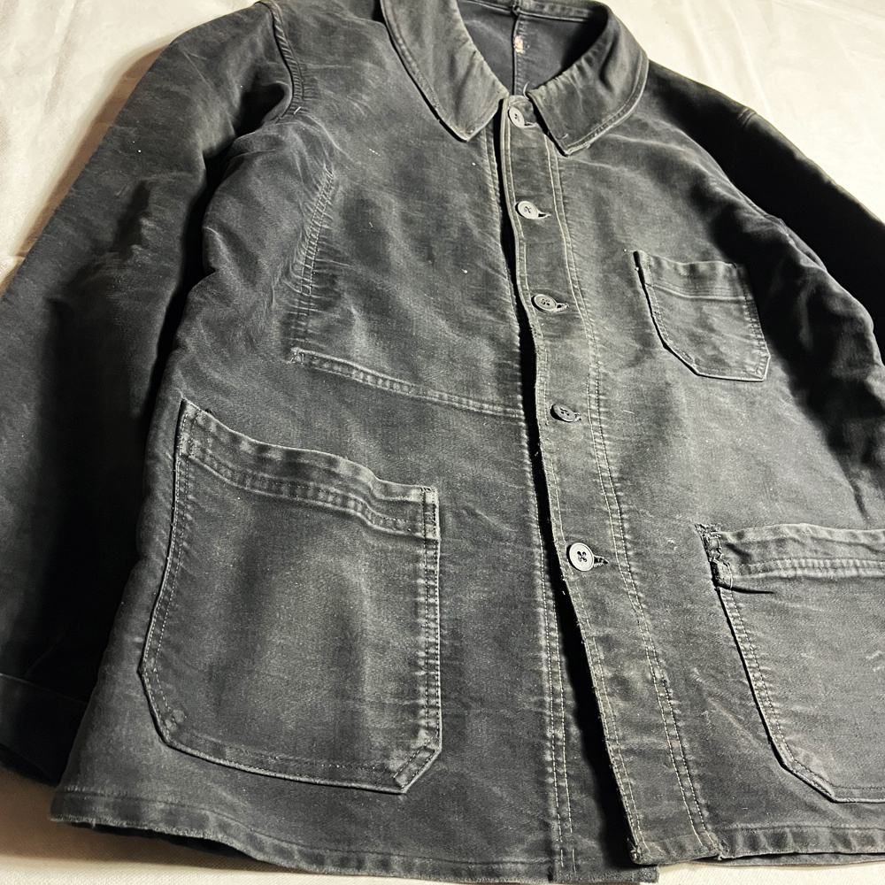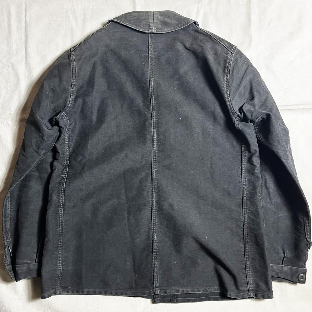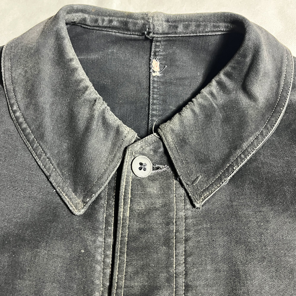 がっしりとした質感のブラックモールスキンジャケット!推定40年代頃の物と思われる、フレンチブラックモールスキンチョアジャケットが入荷して参りました。