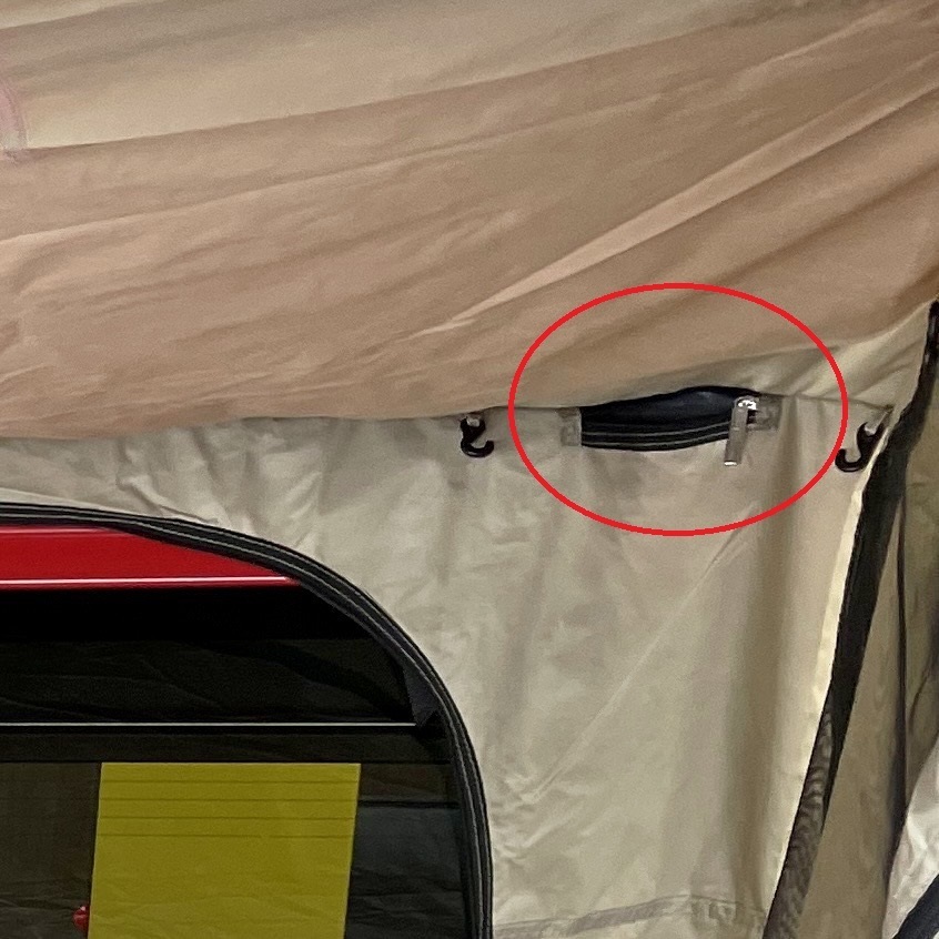 車両側の幕には上部に2か所ジッパー付きポートを用意。電源ケーブルを車両側からひくことが可能 ※画像6枚目