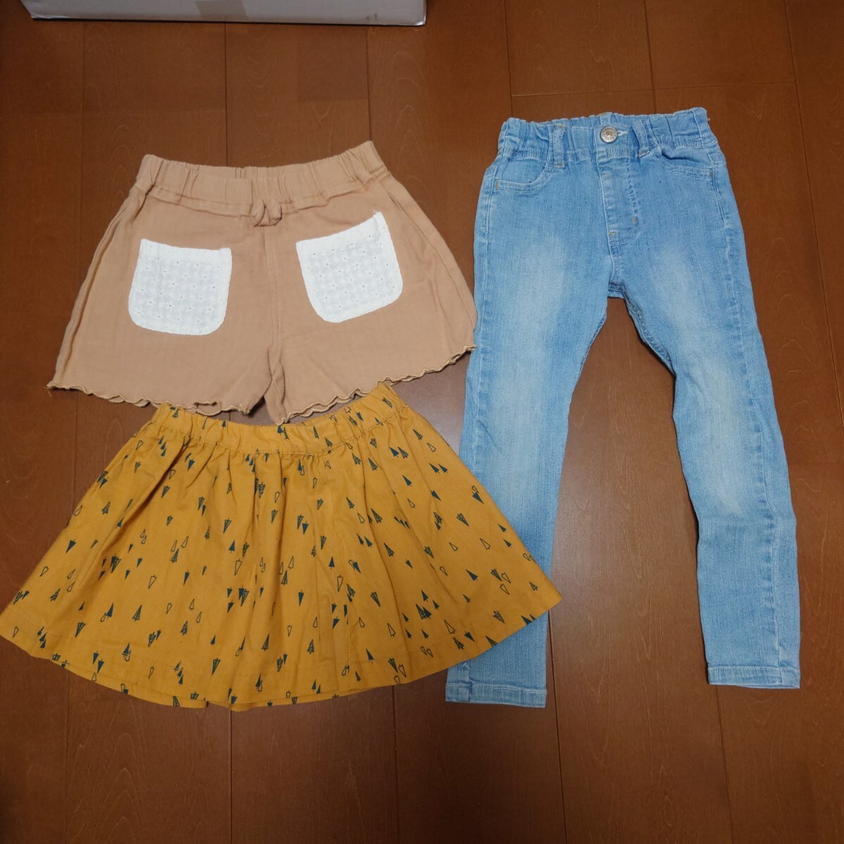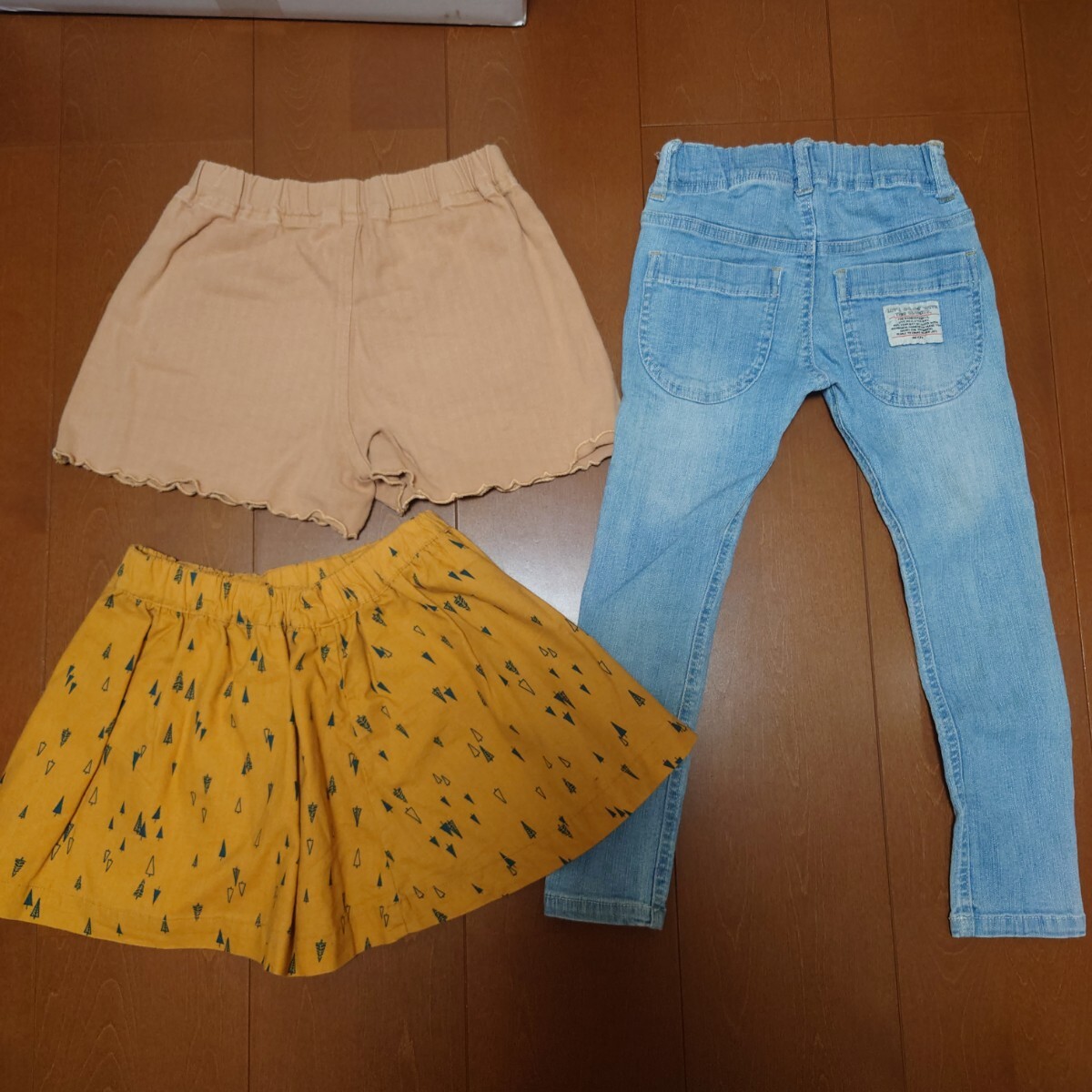 110cmサイズのショートパンツ、スカート、ジーンズの3点セット。