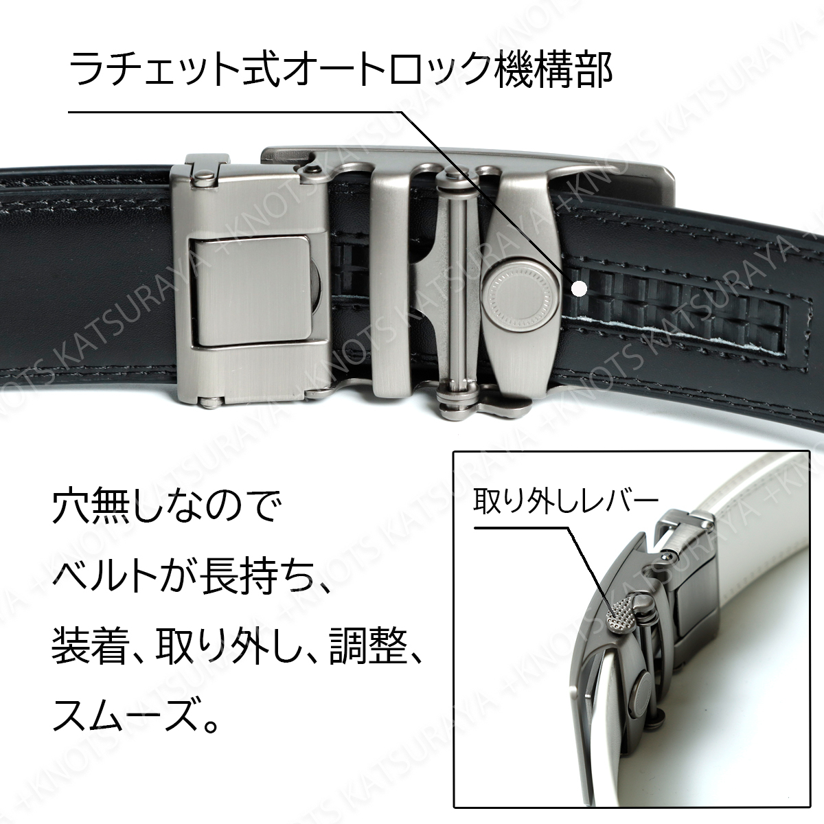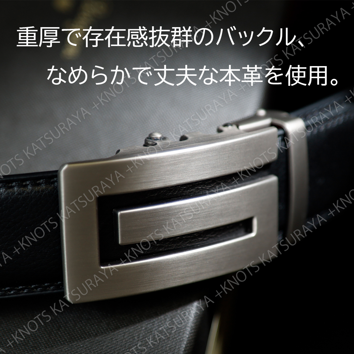 デニムにチノパンに、重厚で個性的なバックルが魅力のオートロック方式本革ベルトです。35段階、約21㎝の可動範囲でラチェット式オートロック機構が働き、装着は差し込むだけ、取り外しや食後の調整はレバーを倒して行います。