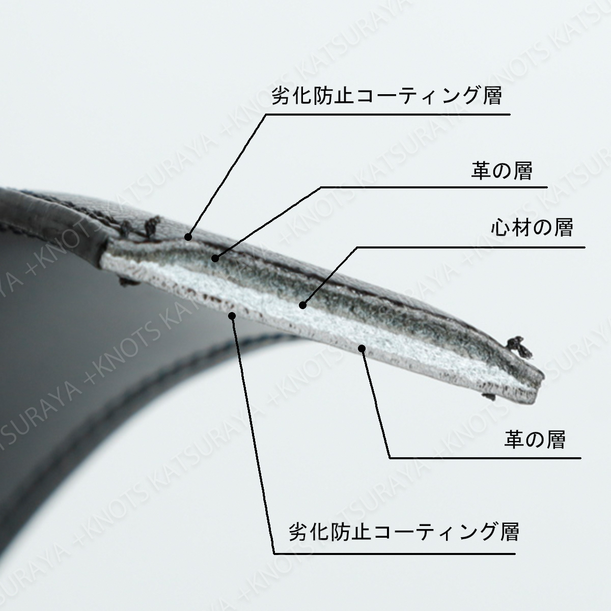 表面に劣化防止コーティングを施し耐久性の高い牛床革を裏表ともに使用しています。ピン通し穴が無いことも長持ちに貢献します。ベルトが長すぎる場合は切断することで調整を行えます。