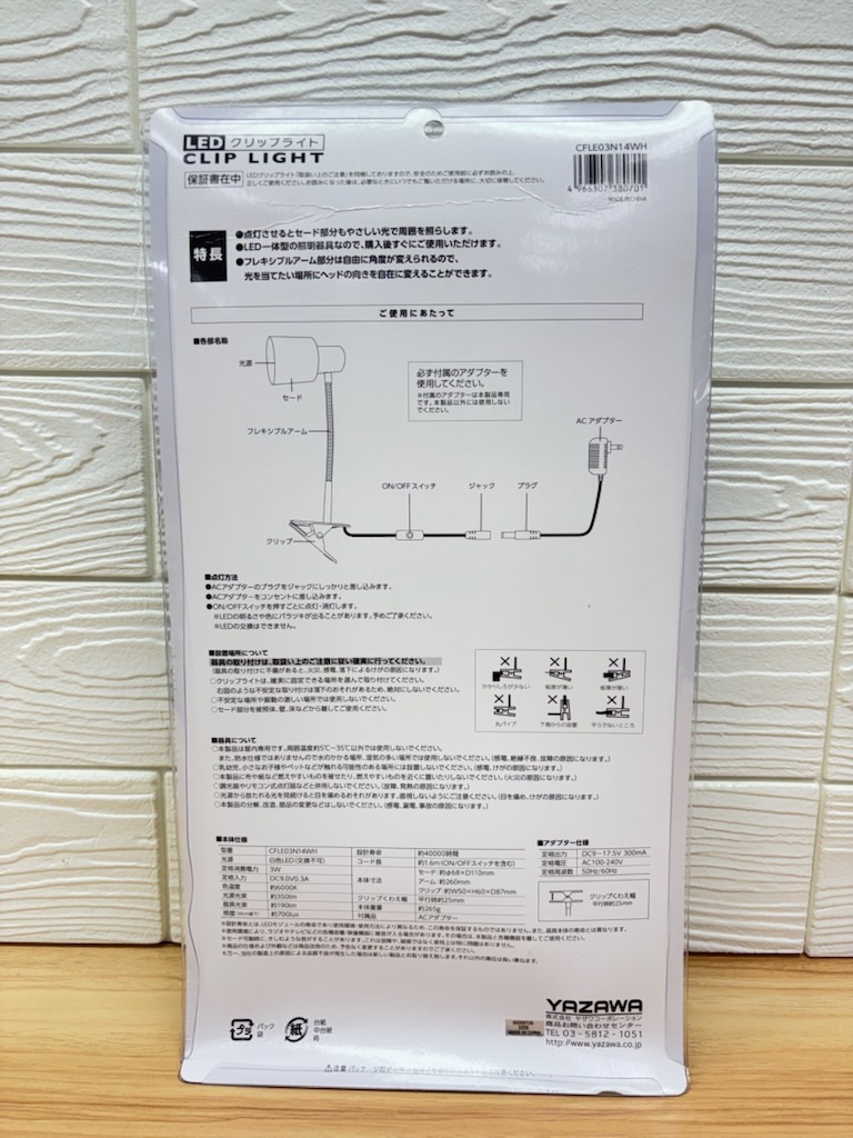 商品名 3Wポリカフレキシブルクリップライト 製品型番 CFLE03N14WH JANコード 4966307380701 本体寸法 W(φ)68mm×H110mm×D 本体重量 約265g カラー ホワイト [材質]