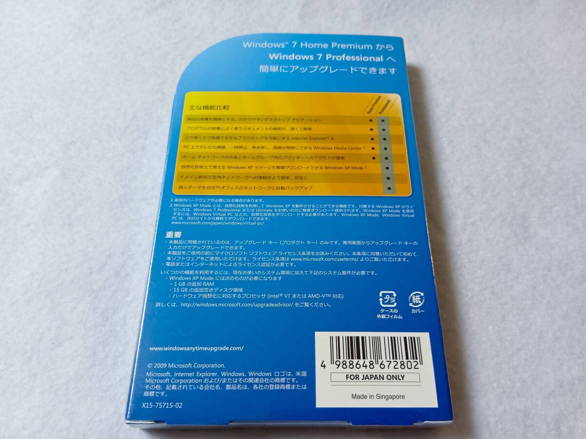 ・製品版 Windows Anytime Upgrade パック (Windows 7 Home Premium から Windows 7 Professional)、プロダクトキーです。本製品のプロダクトキーを使用して、Windows 7 Home Premiumを上位のWindows 7 Professionalへアップグレードする事が可能です。