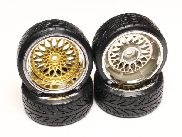 1/10ドリフトカー用 ハードタイヤ組込み済み ゴールドメッシュ激深リムホイール4本セットです。