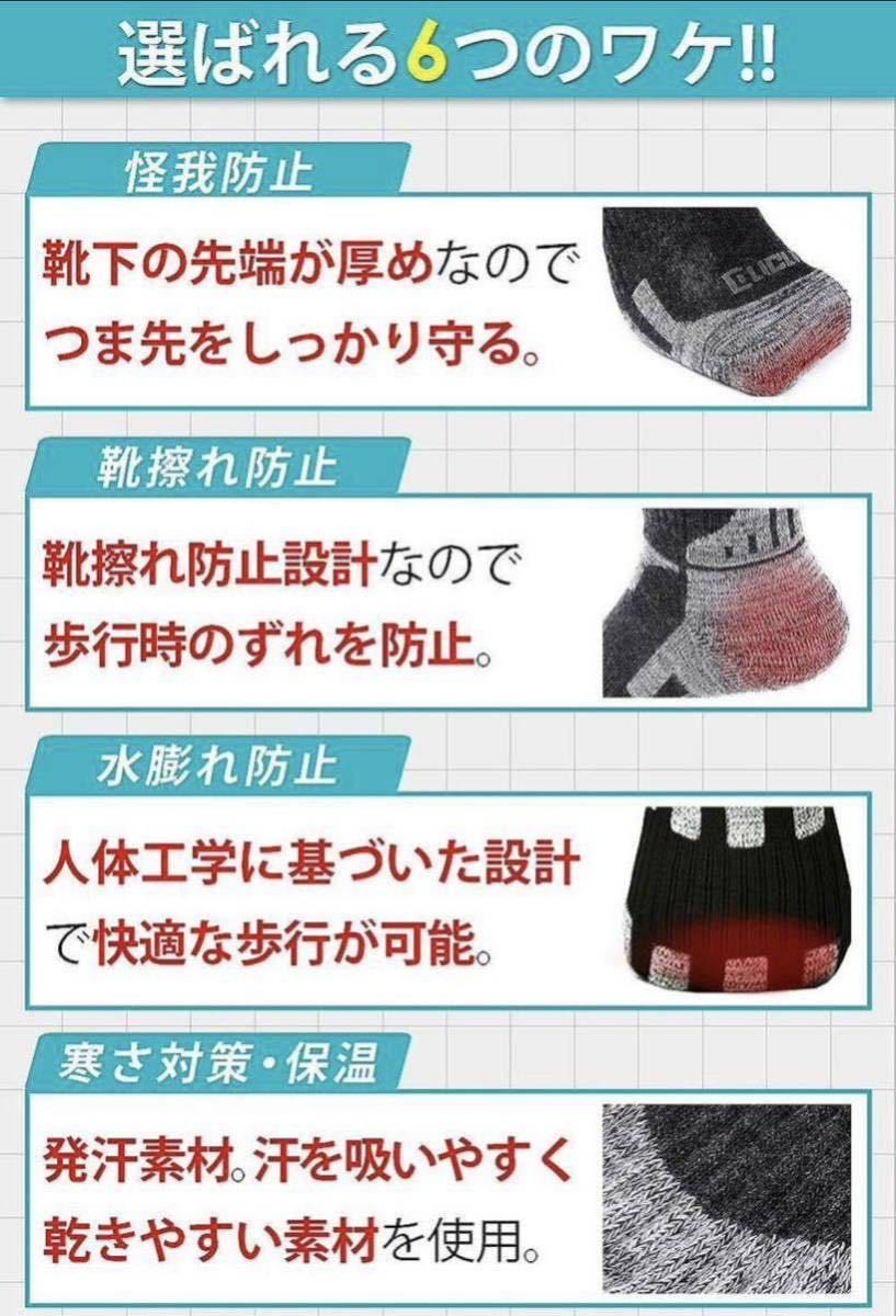 防寒、保温対策ばっちりの靴下です。靴下の先端を厚めにすることで、ケガを防止します。かかとの靴擦れを防止する設計です。通気性にもこだわりました。