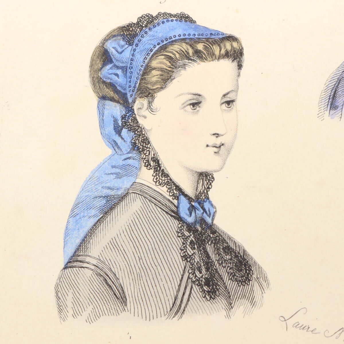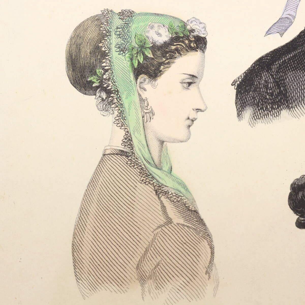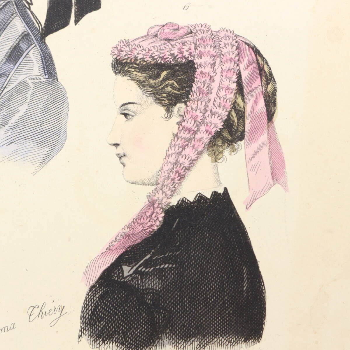 まだ写真が普及していなかった時代に当時のフランスの上流階級の婦人向けの雑誌やカタログの挿絵としてエングレーヴィング(銅版画)のモノクローム印刷に職人たちがやわらかな手彩色を施しました。