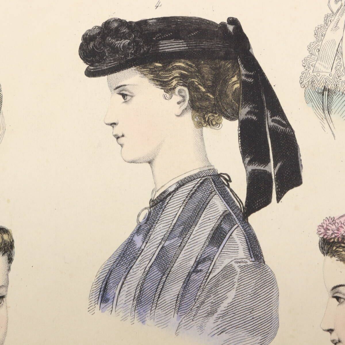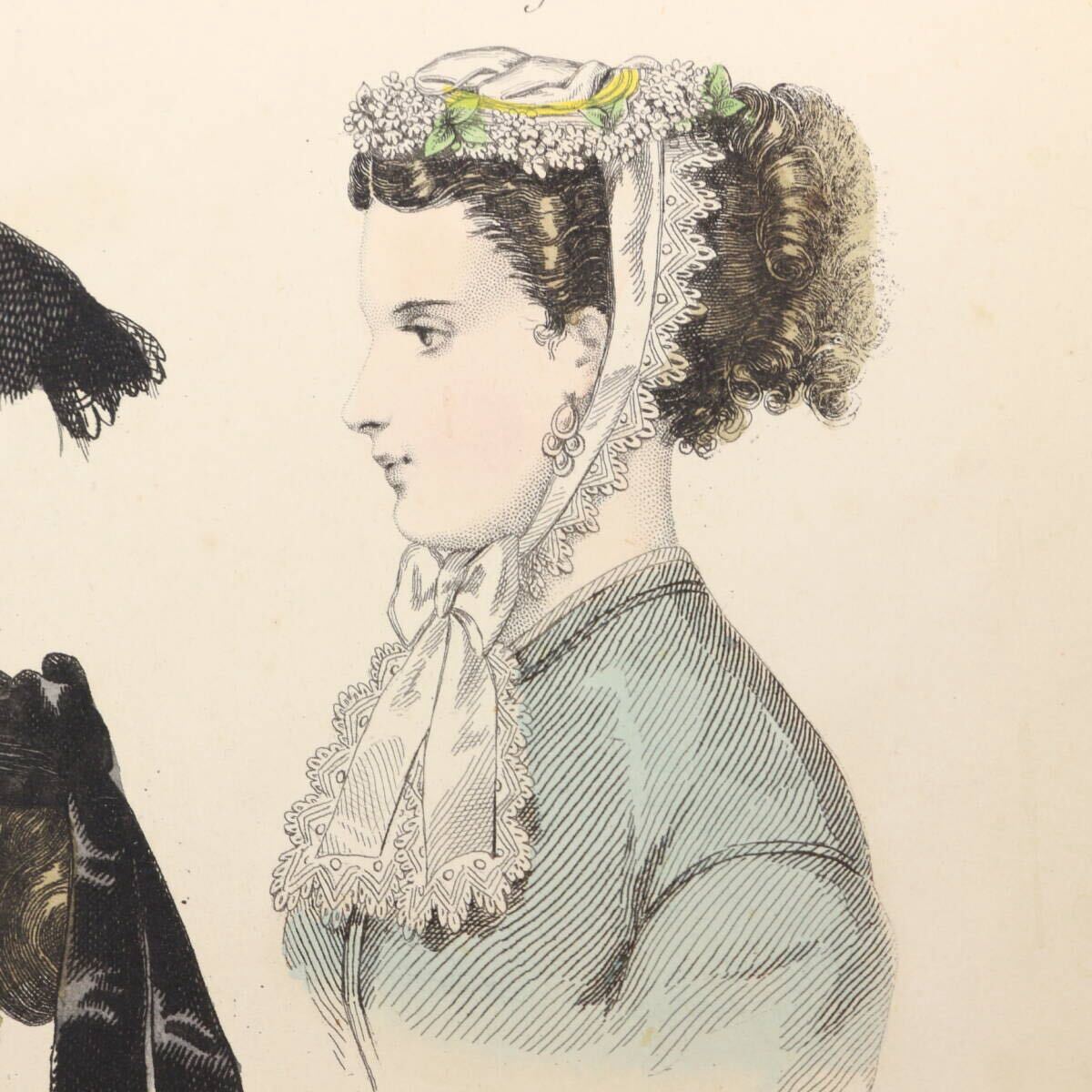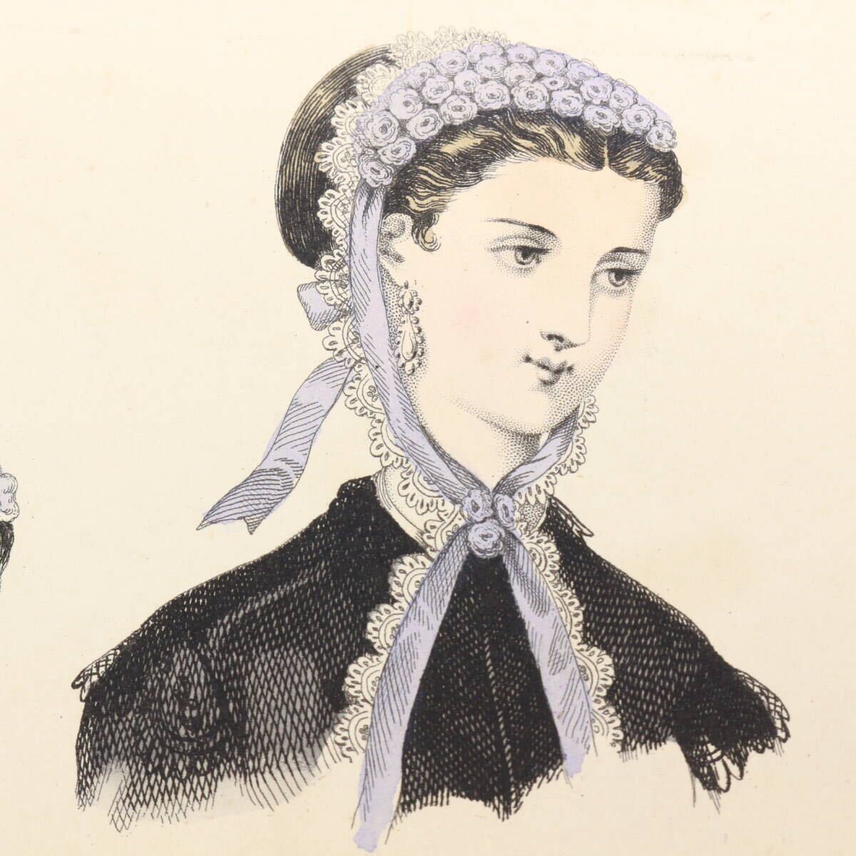 まだ写真が普及していなかった時代に当時のフランスの上流階級の婦人向けの雑誌やカタログの挿絵としてエングレーヴィング(銅版画)のモノクローム印刷に職人たちがやわらかな手彩色を施しました。