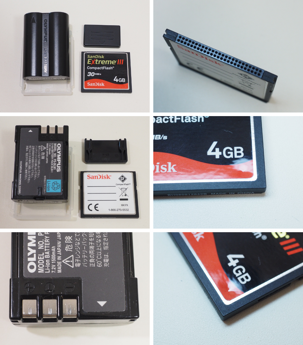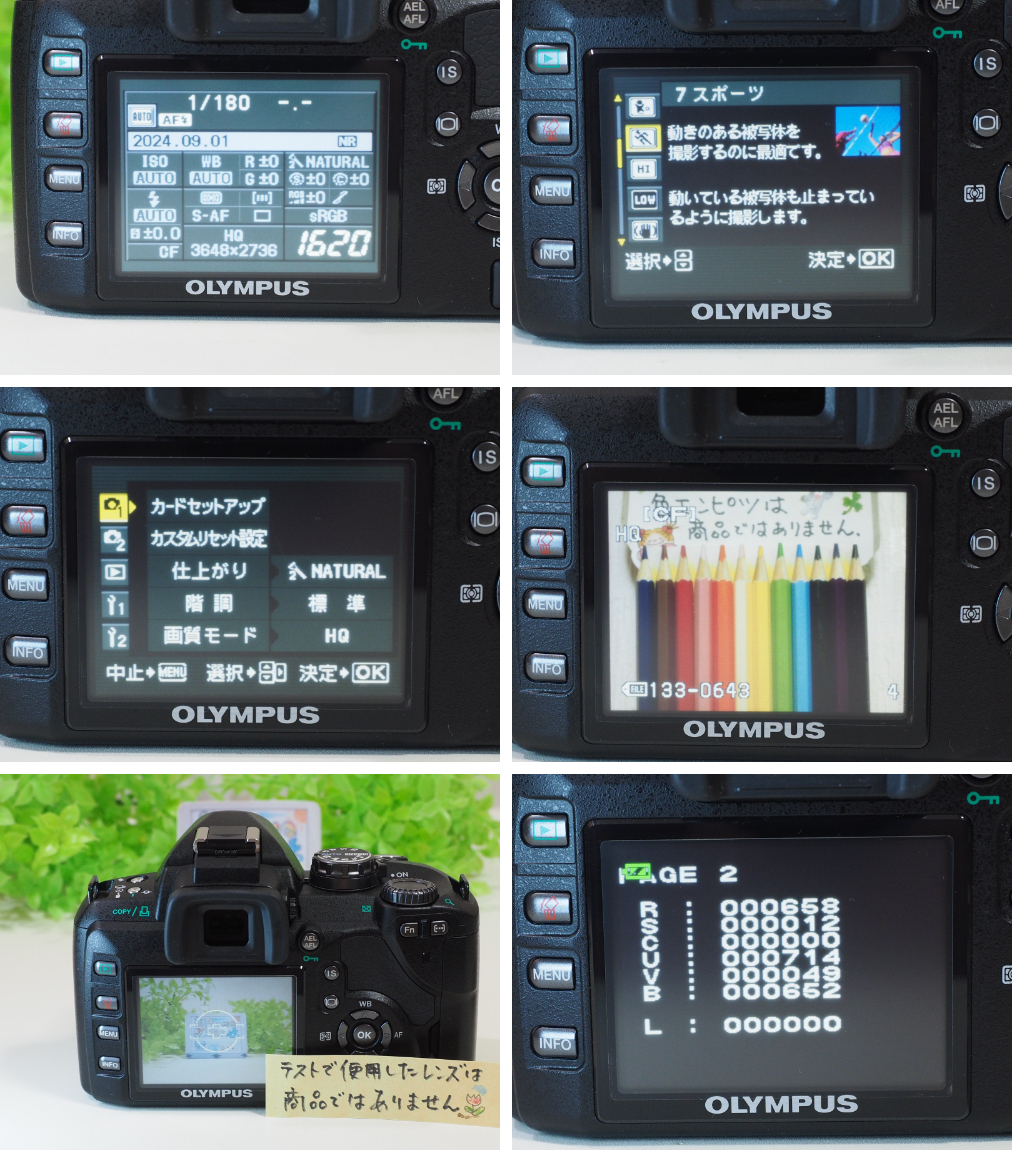 商品の個別チェック項目 (問題なしや該当なしは - 印) 作動チェックに関する項目 【電源ON/OFF】 チェックOK(E-410やE-510などの機種は電源部分の接触の不良が多いですが、当商品は、電源部分に軽い衝撃を与えたりモード切替ダイヤルを回しても接触不良はおきませんでした。) 【液晶表示】 チェックOK 【写真撮影】 手持ちのxDピクチャーカードと付属のCFカードにてチェックOK(xDピクチャーカードは付属しません) 【フラッシュ撮影】 チェックOK 【ファインダー】 チェックOK(チリの混入もなさそうです) 【各種ボタンの反応】 チェックOK 【PC接続】 チェックOK(付属のコードを使用) 【日付保持】 × (バッテリーを抜くと日付情報はリセットされました) 【カードスロット】 手持ちのxDピクチャーカードと手持ちのCFカードにてチェックOK(メモリーカードは付属しません) 【充電器】 チェックOK 【電池ボックス】 腐食なし 【レンズ】 付属しません 【バッテリー】 バッテリーは1本でオリンパスの純正品です。(作動テストでは充電も含めて普通に使えましたが、長時間のテストはしていません。参考:7.65Vから充電を開始し2時間程度充電していました。) その他の項目 【外観】 気になる傷はありませんが、アイカップに軽いスレ傷があります 【液晶面】 液晶面は新品時のフィルムが貼られていましたが、当方ではがして少しクモリ感のある反射防止の保護フィルムを貼りました。(保護フィルムをはがせば無傷です。※少しクモリ感のある保護フィルムを貼ったことで、表示される文字などが少しボケた感じに見えるかもしれません。気になる場合は保護フィルムをはがしてご使用ください。保護フィルムはオマケ程度にお考え下さい。) |