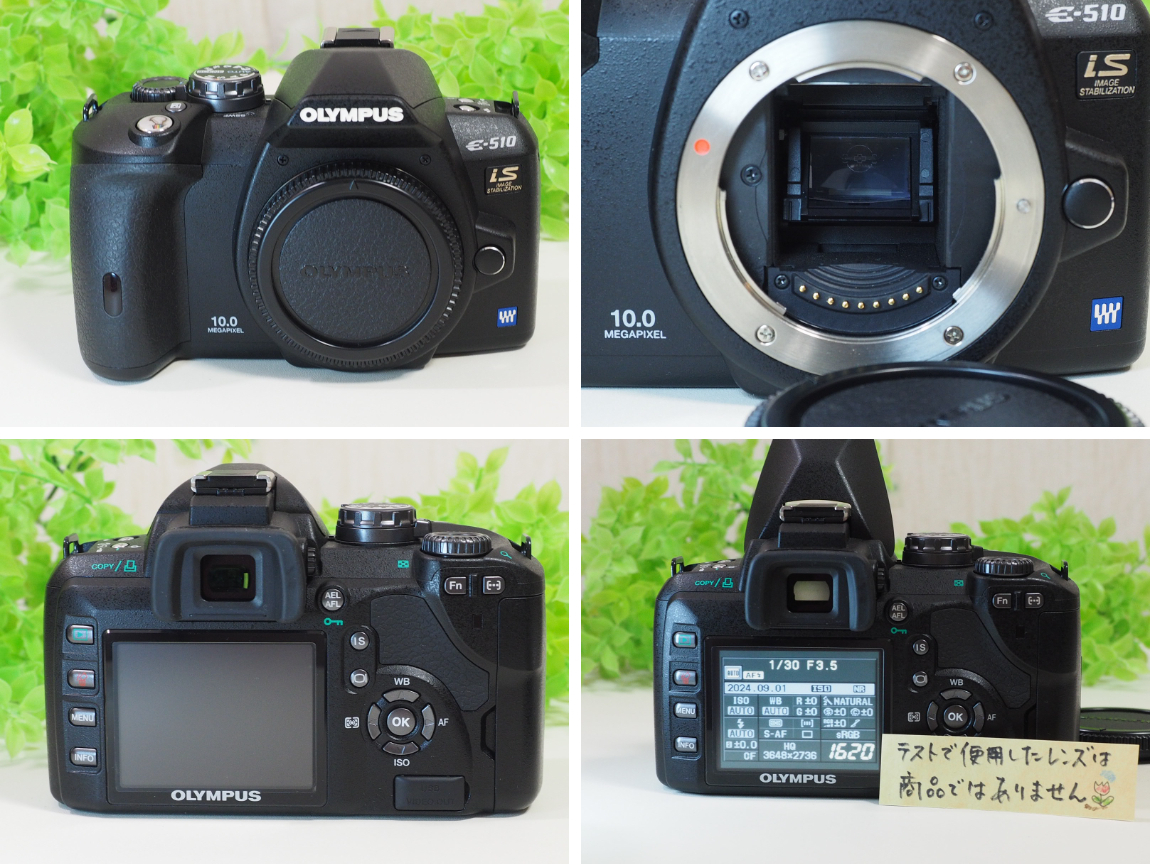 商品の補足説明(主観的な内容も含む) シャッター回数(撮影枚数)は、まだ658枚くらいです。 バッテリーを抜くと日付がリセットされてしまいますが、まだシャッター回数も少なく、各ボタンやダイヤルなどはまだ新品に近い感触で、撮影・再生・消去・フラッシュ・明るさの変更などの基本的な機能はチェック済みで正常です。(ただし、細かいチェックまではしていません) 商品は1枚目の写真でご判断いただければと思いますが、カメラボディ・充電器・バッテリー1個・CFカード・説明書類・コード2種類・アイピースカバーのセットです。 CFカードは4GBです。 元箱はありません。 レンズやストラップは付属しません。 E-510はフォーサーズ規格ですので、マイクロフォーサーズのレンズは装着できませんのでご注意ください。 おてがる配送宅急便での発送を予定しています。(送料無料で出品) |