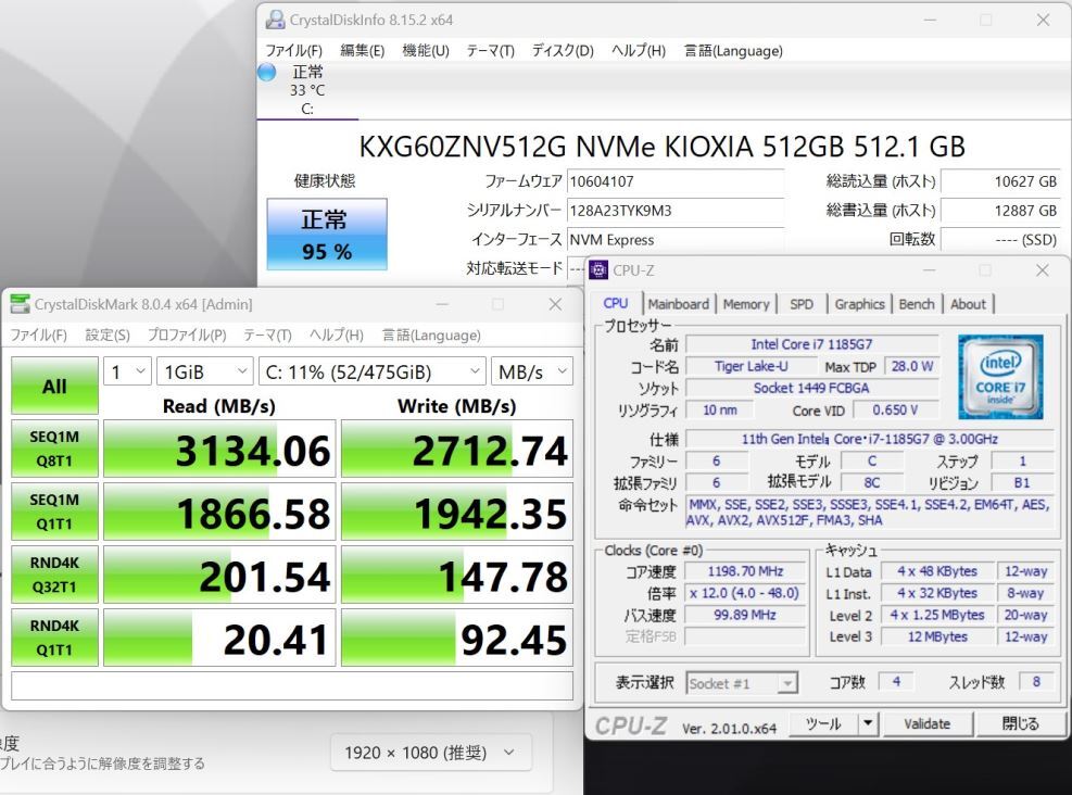 | CPU: 超高速 Intel 卓越性能 11世代Core i7-1185G7 3.0Ghz、 4コア8スレッド (ターボ・ブースト利用時の最大周波数 4.8GHz) |