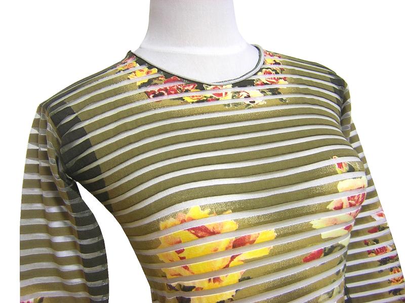 Jean Paul GAULTIER MAILLE FEMME のイタリア製、 花柄ボーダーパワーネットカットソーでございます。 伸縮性あり/透け感あり/七部袖 | |