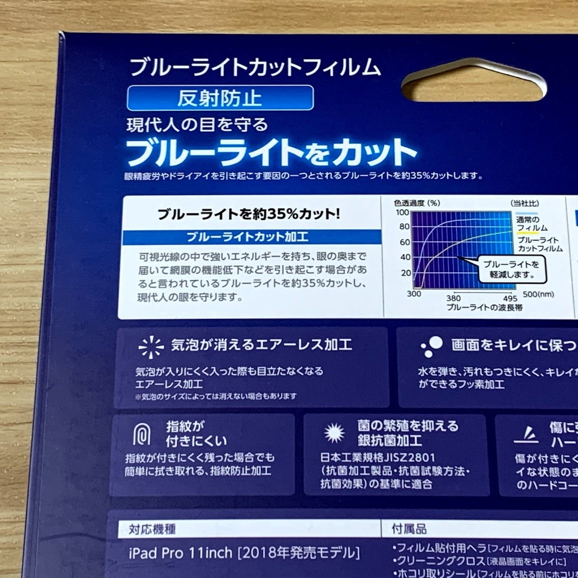 ■ディスプレイを見続ける機会が多い現代人の目を考えて開発。液晶ディスプレイが発する光の中の青い部分「ブルーライト」を大幅にカットするiPad Pro 11インチ 2018年モデル用の液晶保護フィルムです。